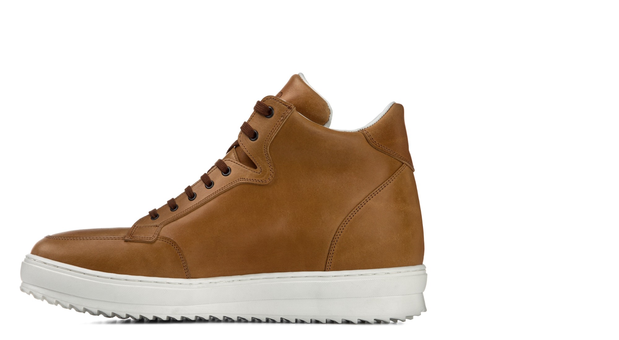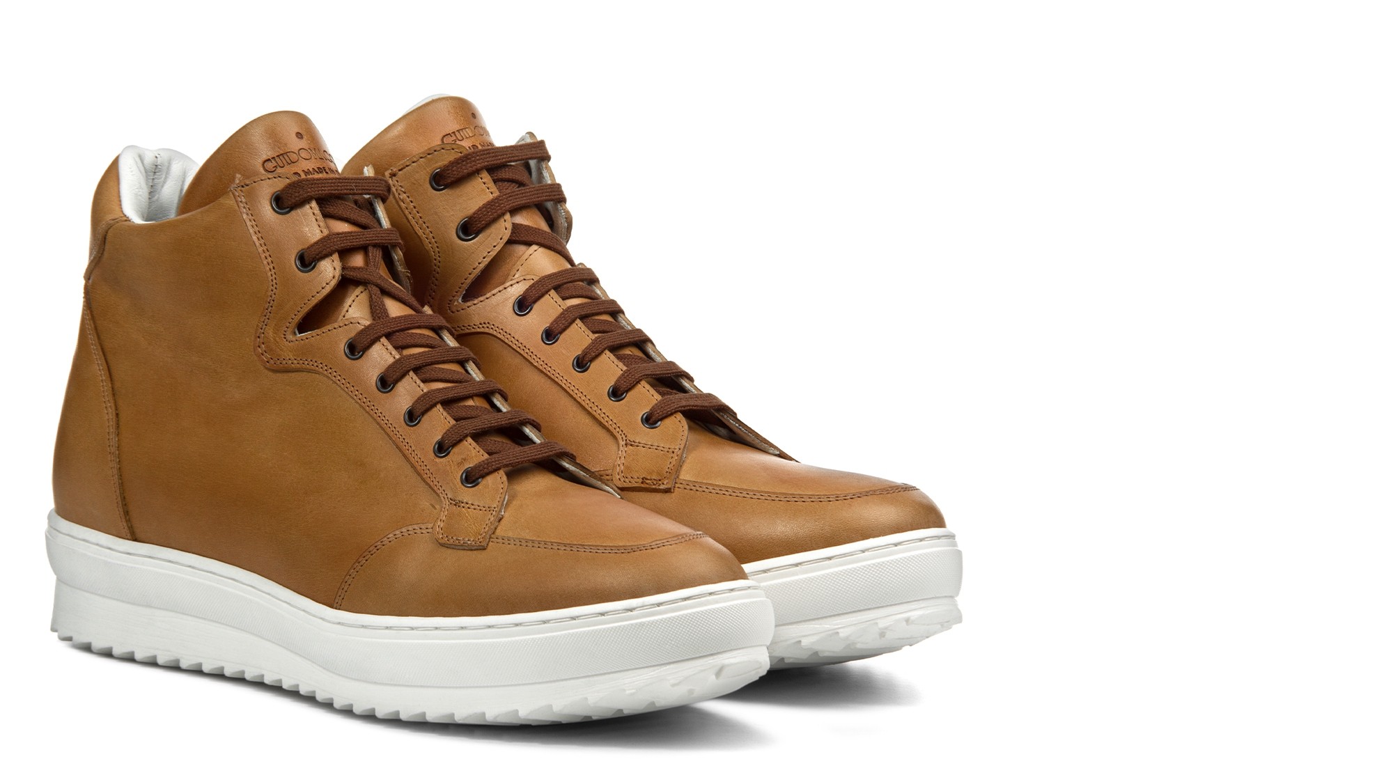 Ce modèle de nouvelles tennis compensées en cuir pleine fleur couleur Cognac, fabriqué par la Maison GuidoMaggi, a été baptisé « Worth Avenue ». Le traitement que nous avons fait subir au cuir lui donne un aspect « vintage » rétro.