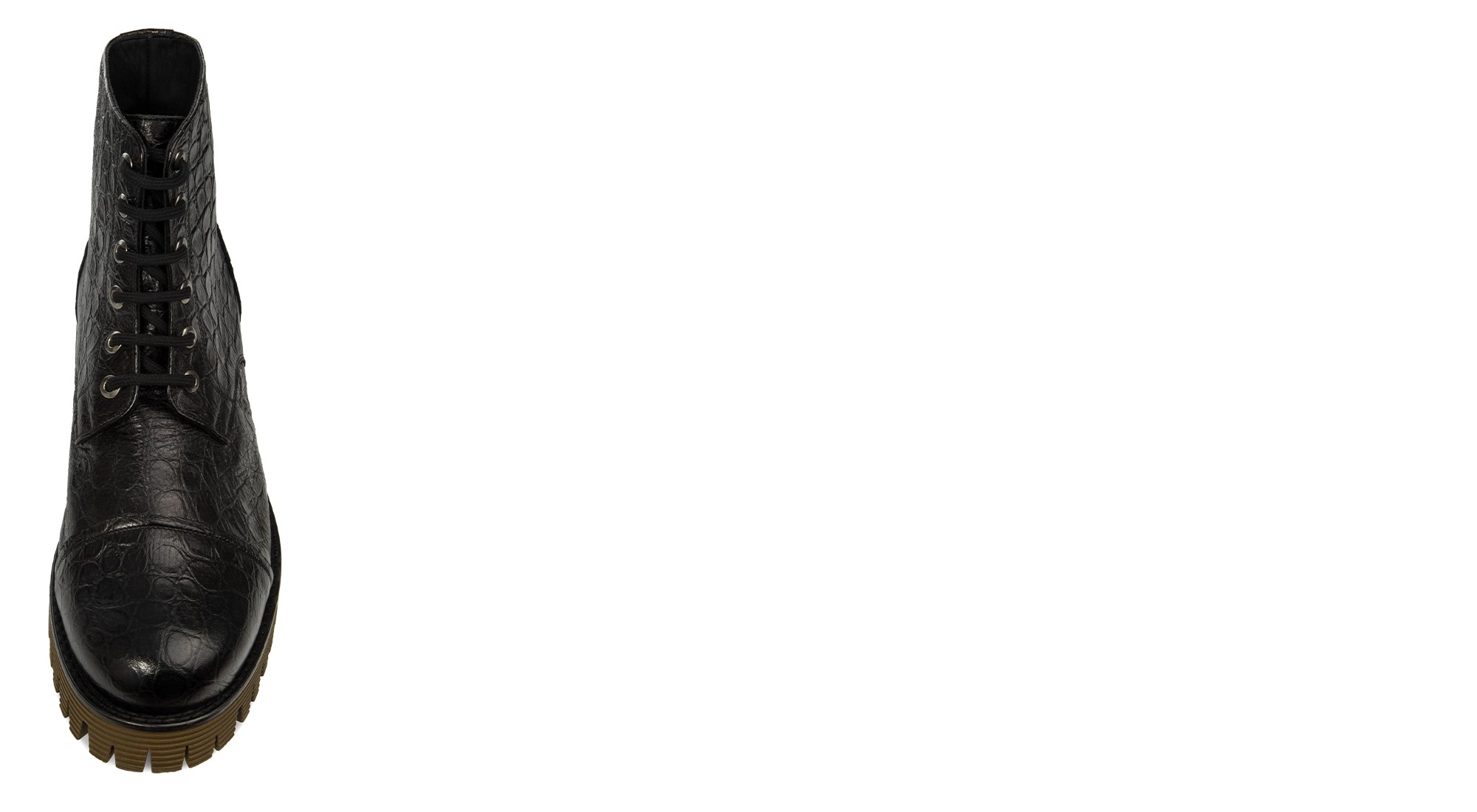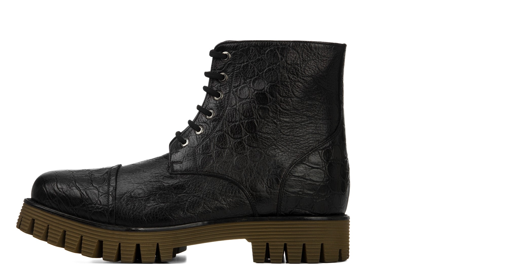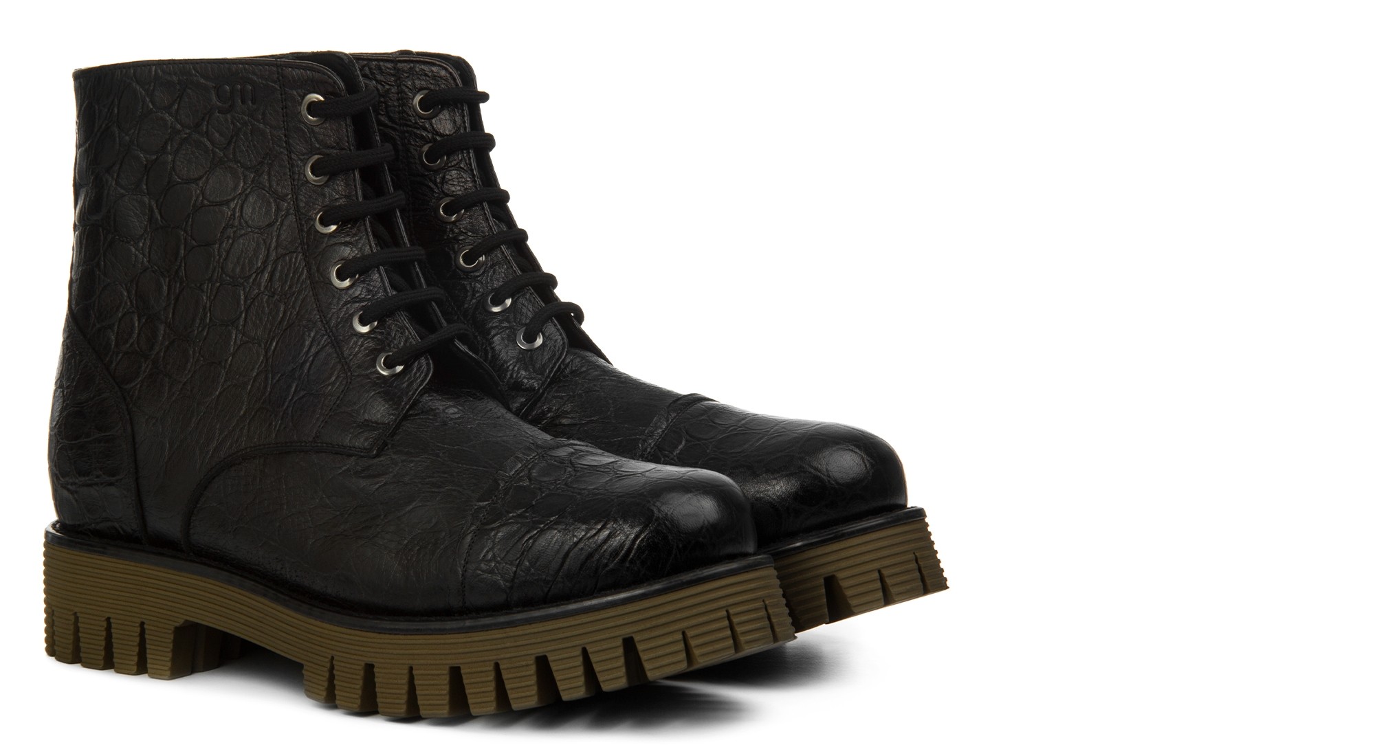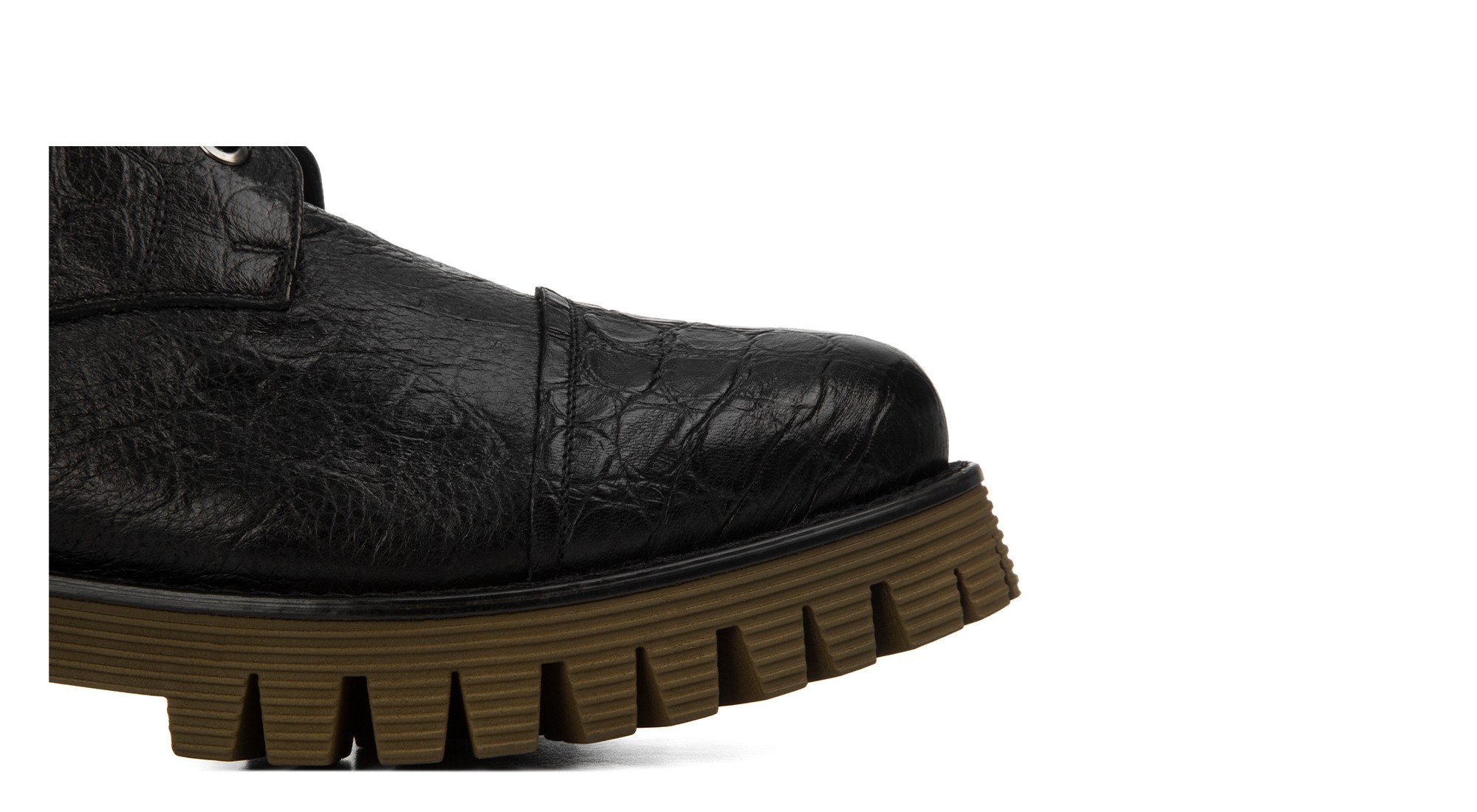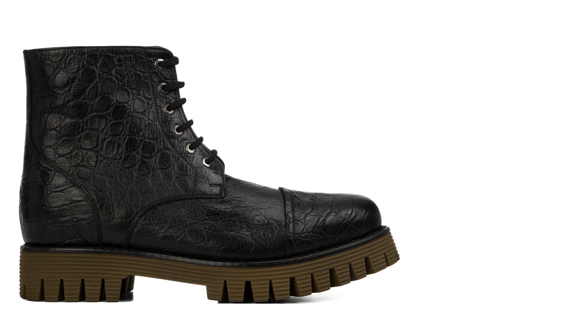 Le bottin Barga présente un cuir de veau façon crocodile, une semelle crantée de couleur kaki très confortable et un look extrêmement affirmé.