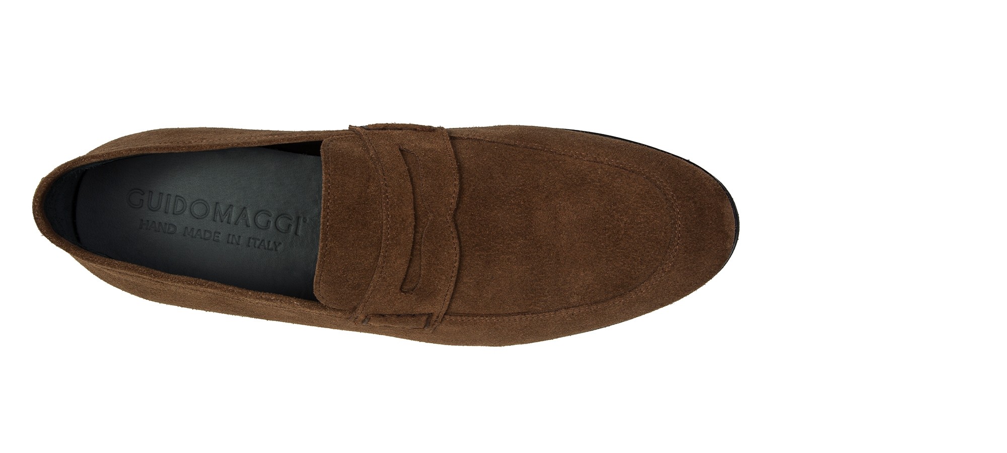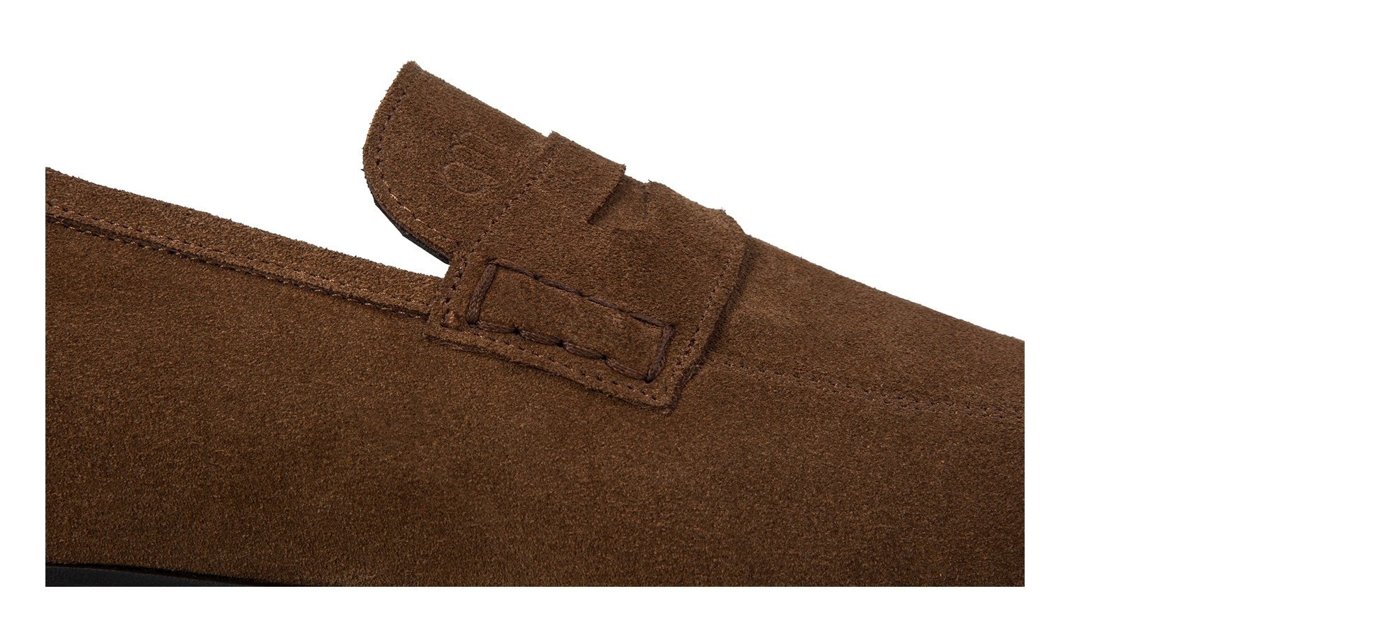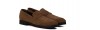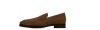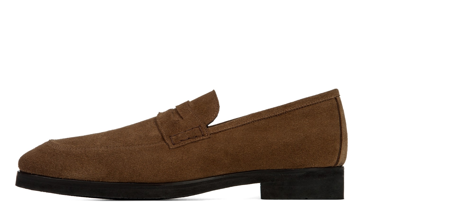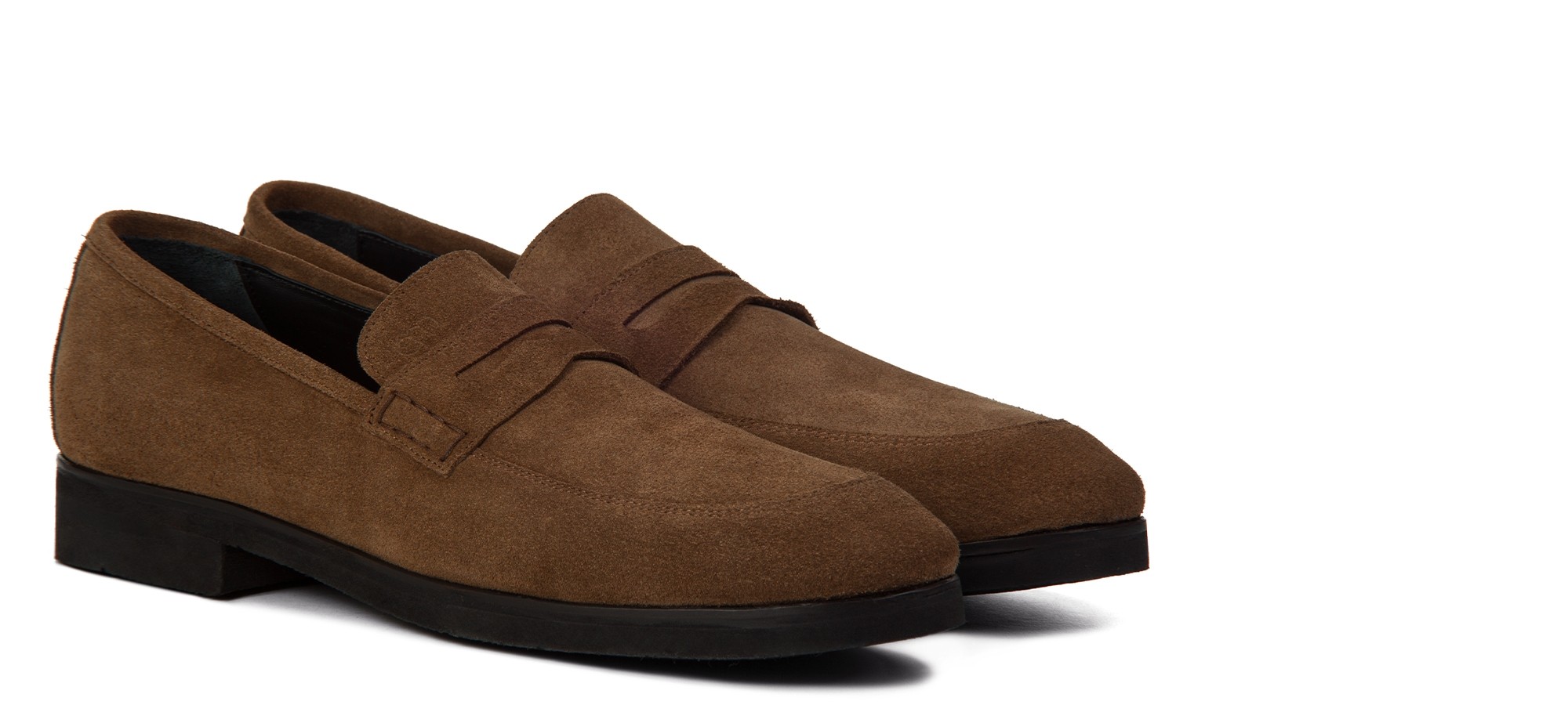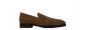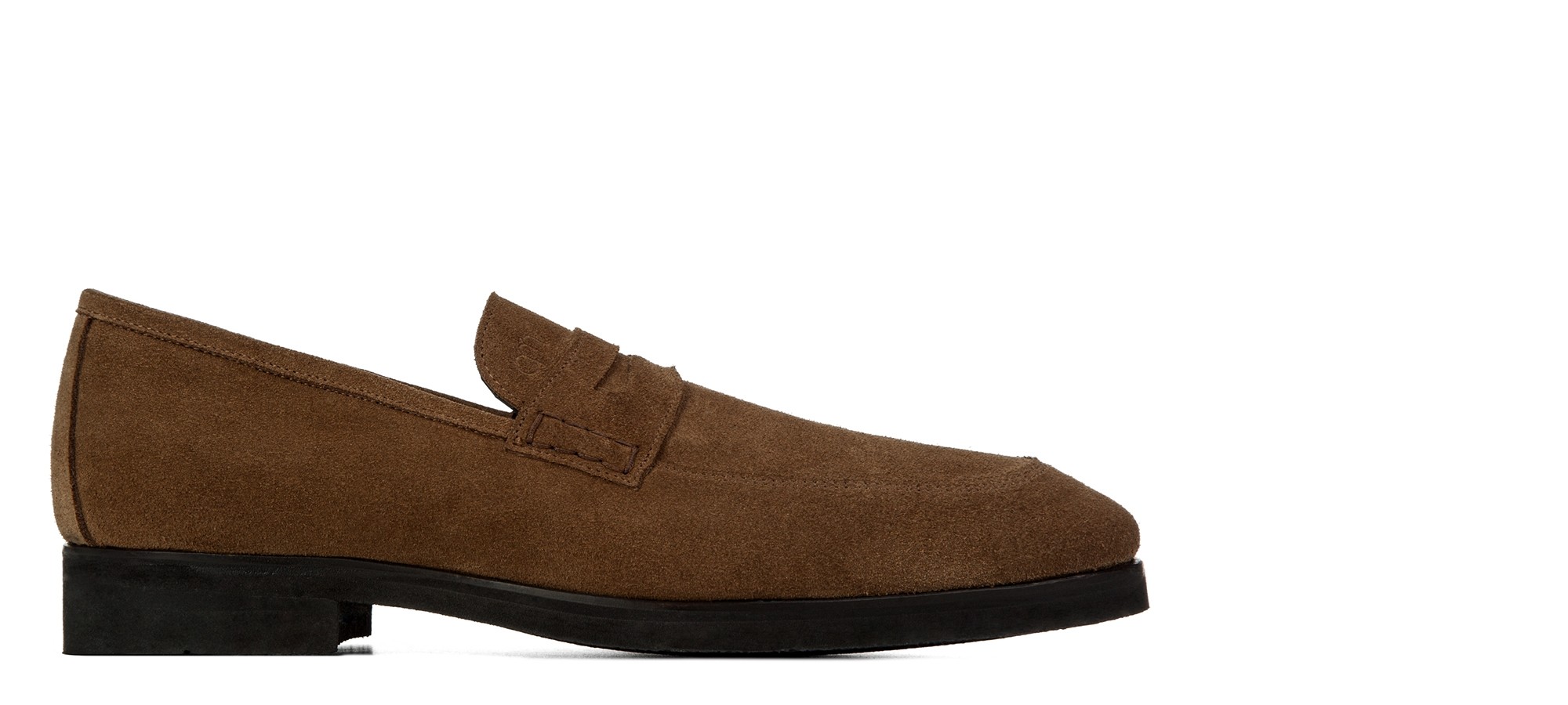 Mocassin penny rehaussant en daim souple aux nuances brunes élégantes effet velouté. La semelle en caoutchouc Vibram, flexible et confortable, est cousue apparente pour une touche artisanale.