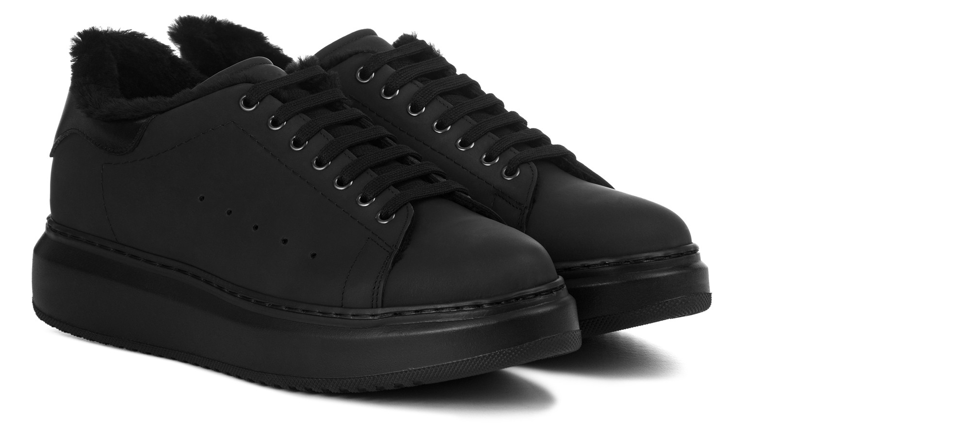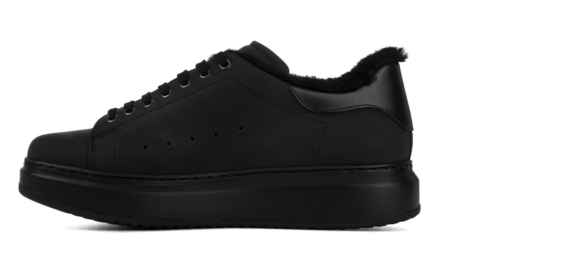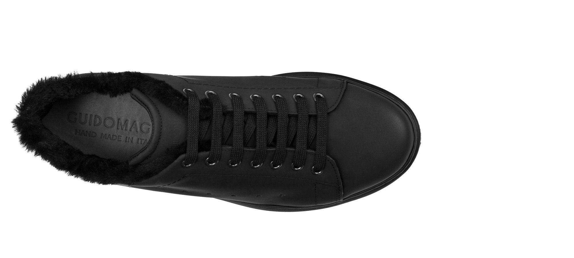 Des lignes souples et arrondies caractérisent la nouvelle sneaker total black Cerveteri, signée GuidoMaggi. La tige en cuir mat gommé est associée à une doublure en mouton retourné noir pour un confort thermique optimal. La semelle noire ultra-légère et amortissante offre un look vif et moderne, sublimé par un contrefort en cuir pleine fleur.