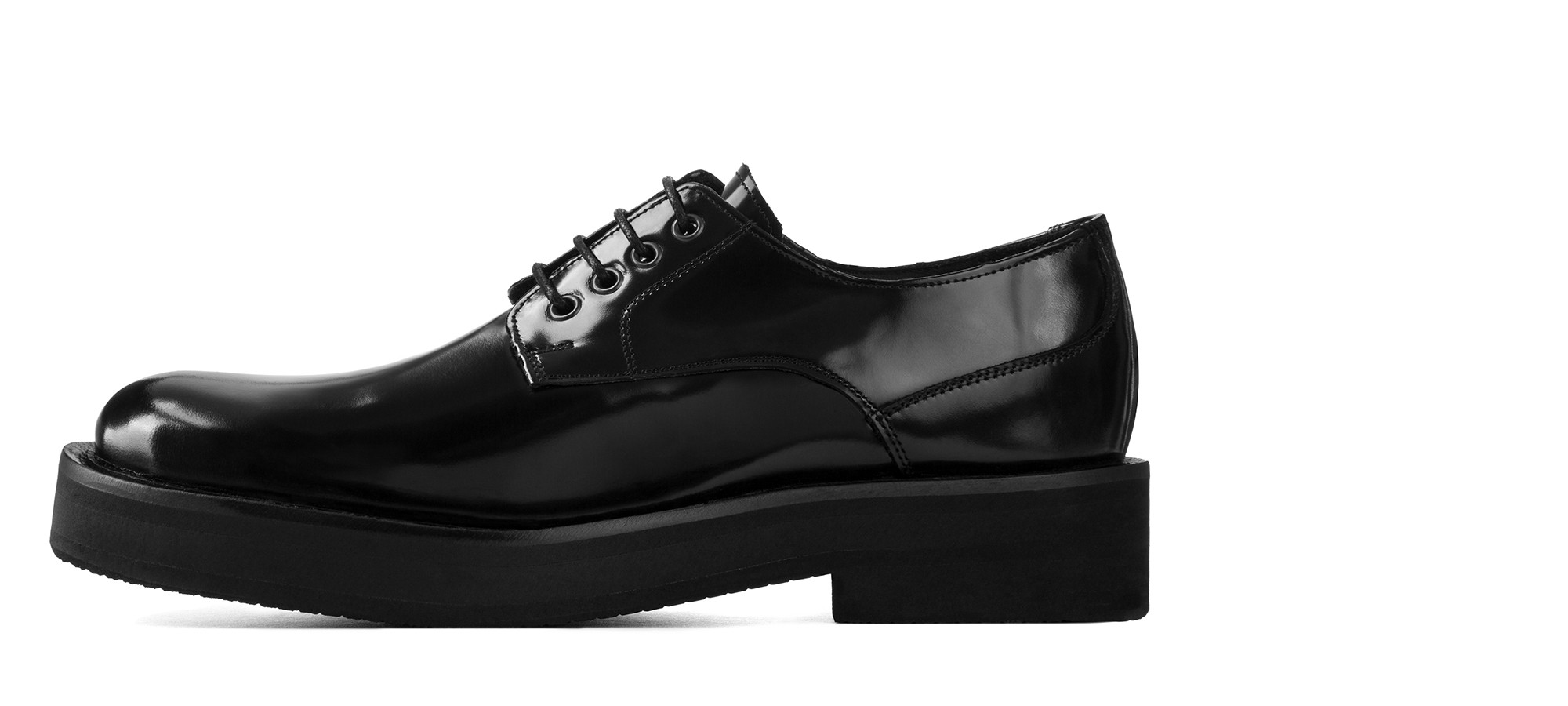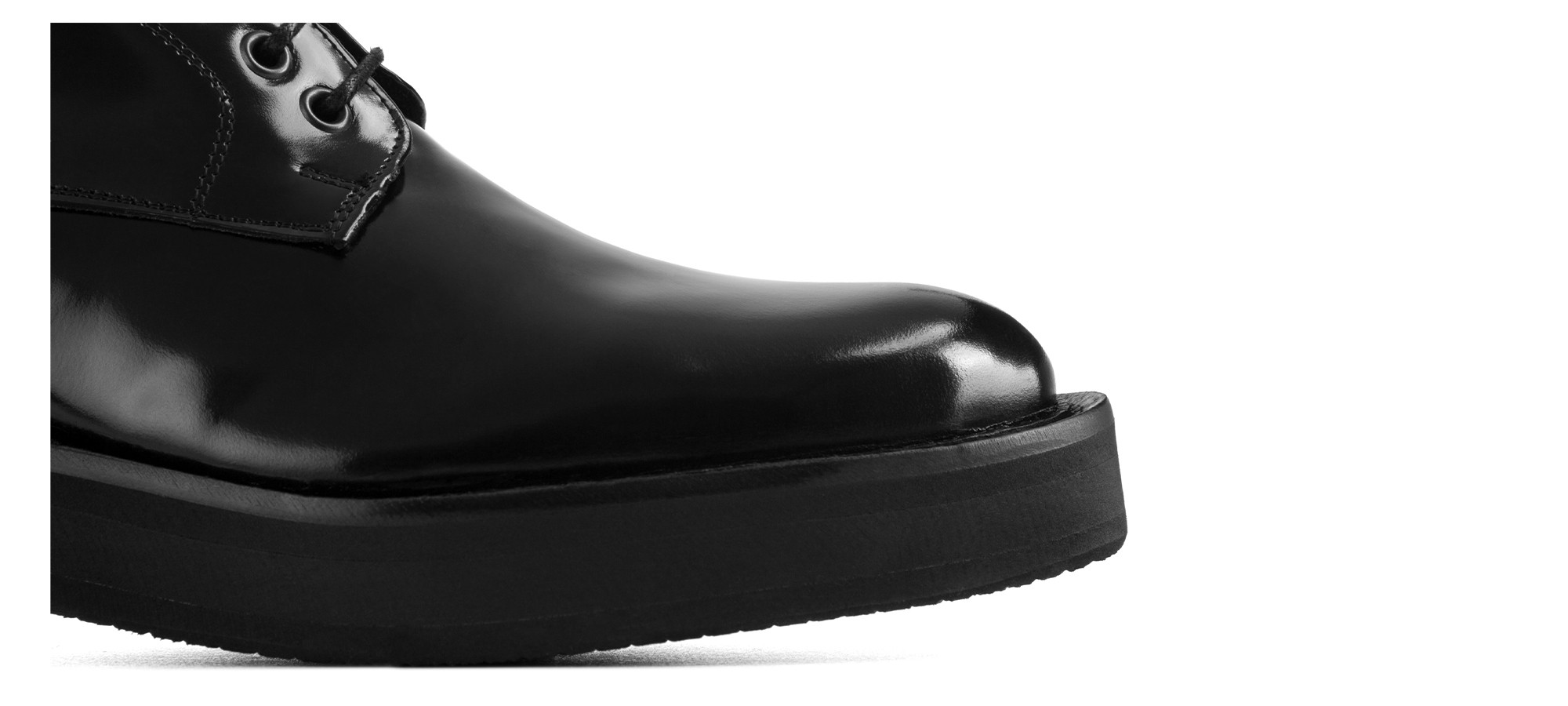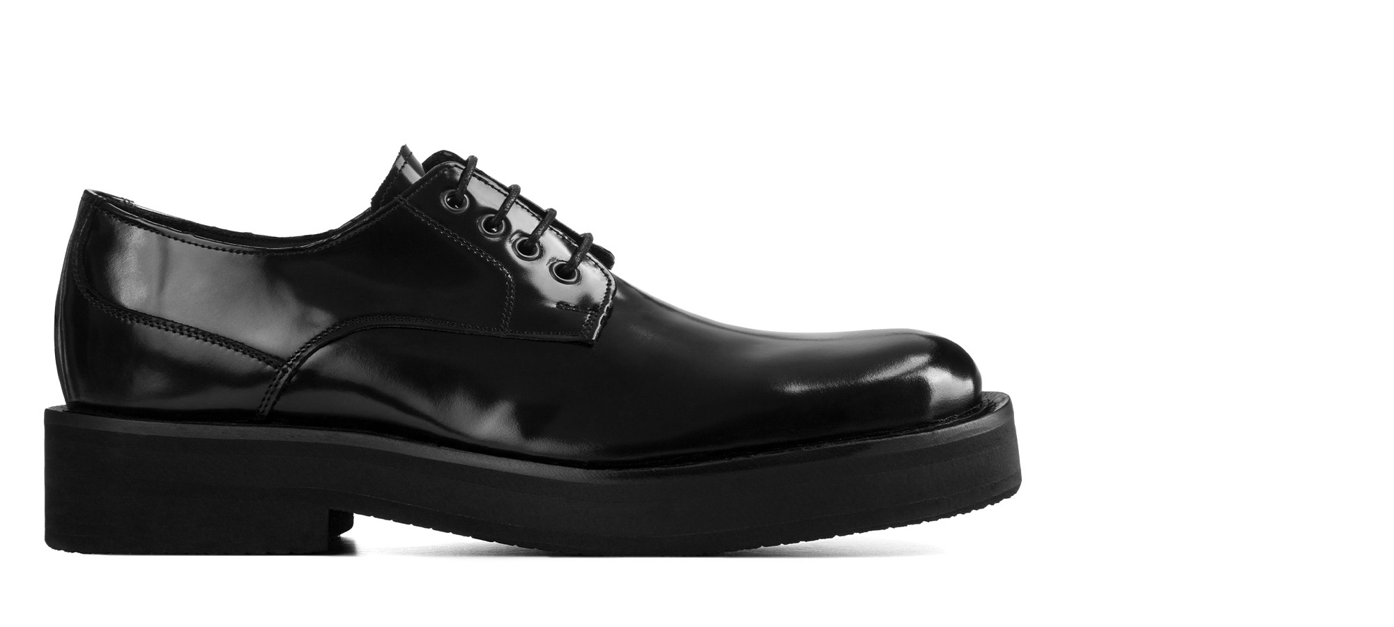 Le modèle Panoramica est une derby en cuir verni au caractère audacieux, rendue unique par sa semelle aux volumes généreux et la brillance profonde du cuir. Idéale pour des looks minimaux mais affirmés, elle intègre un système de rehaussement interne qui permet de gagner jusqu’à 8 centimètres avec discrétion et style.