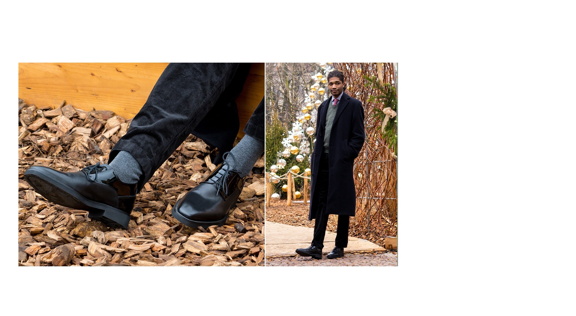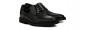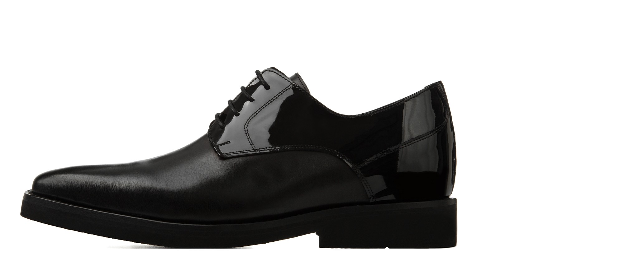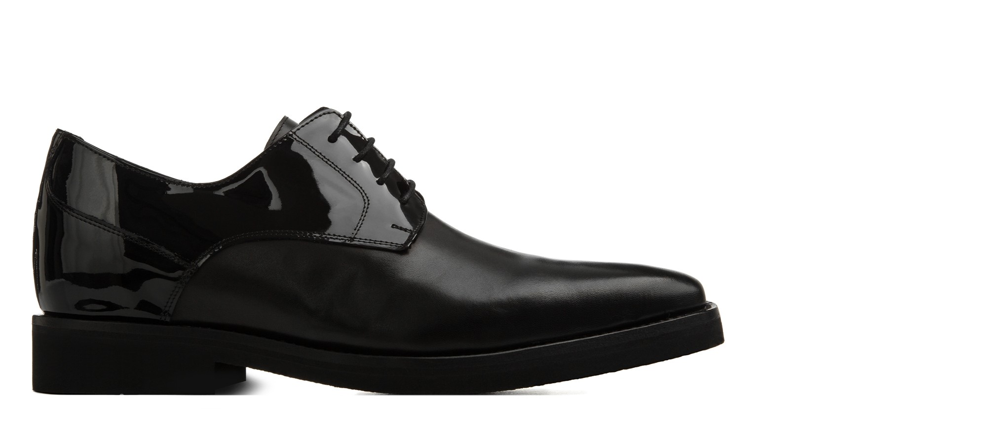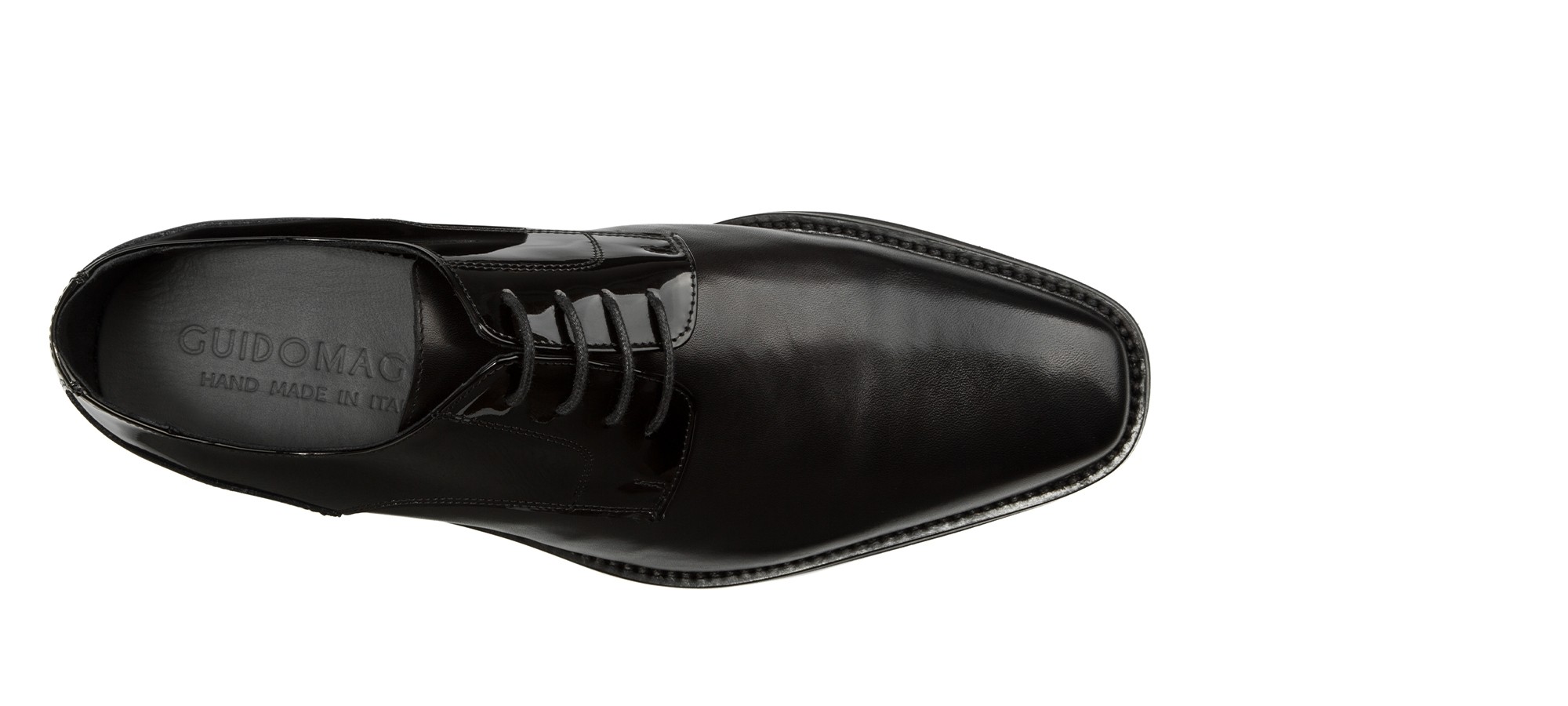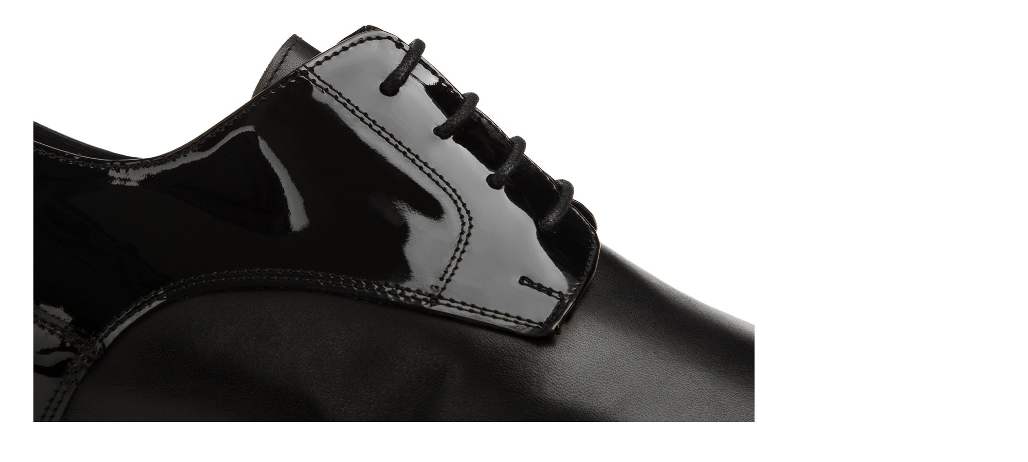Derby classique avec rehausse intérieure, cousue main, au style élégant et aux lignes sophistiquées. La tige associe un cuir noir pleine fleur sur la pointe à du cuir verni noir sur les quartiers, pour un rendu raffiné et lumineux. Le bout carré apporte une touche moderne et affirmée au design.