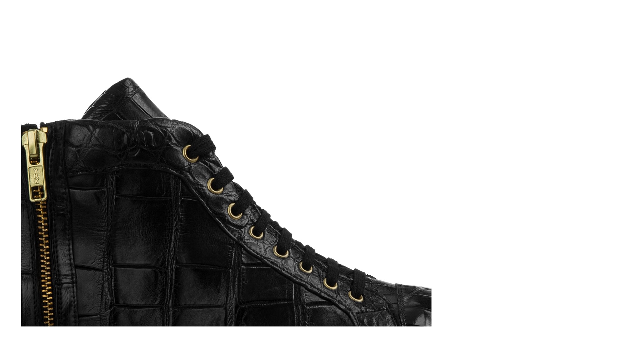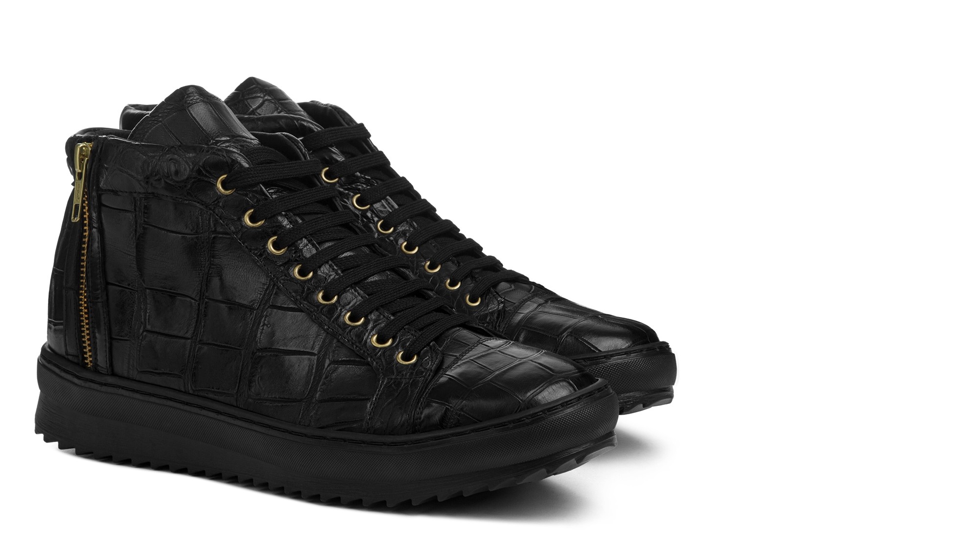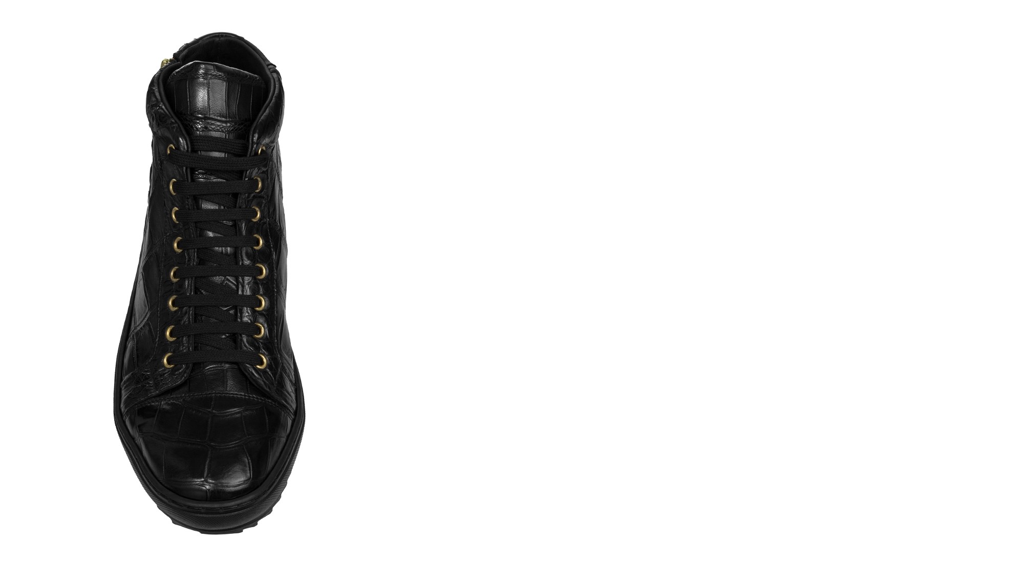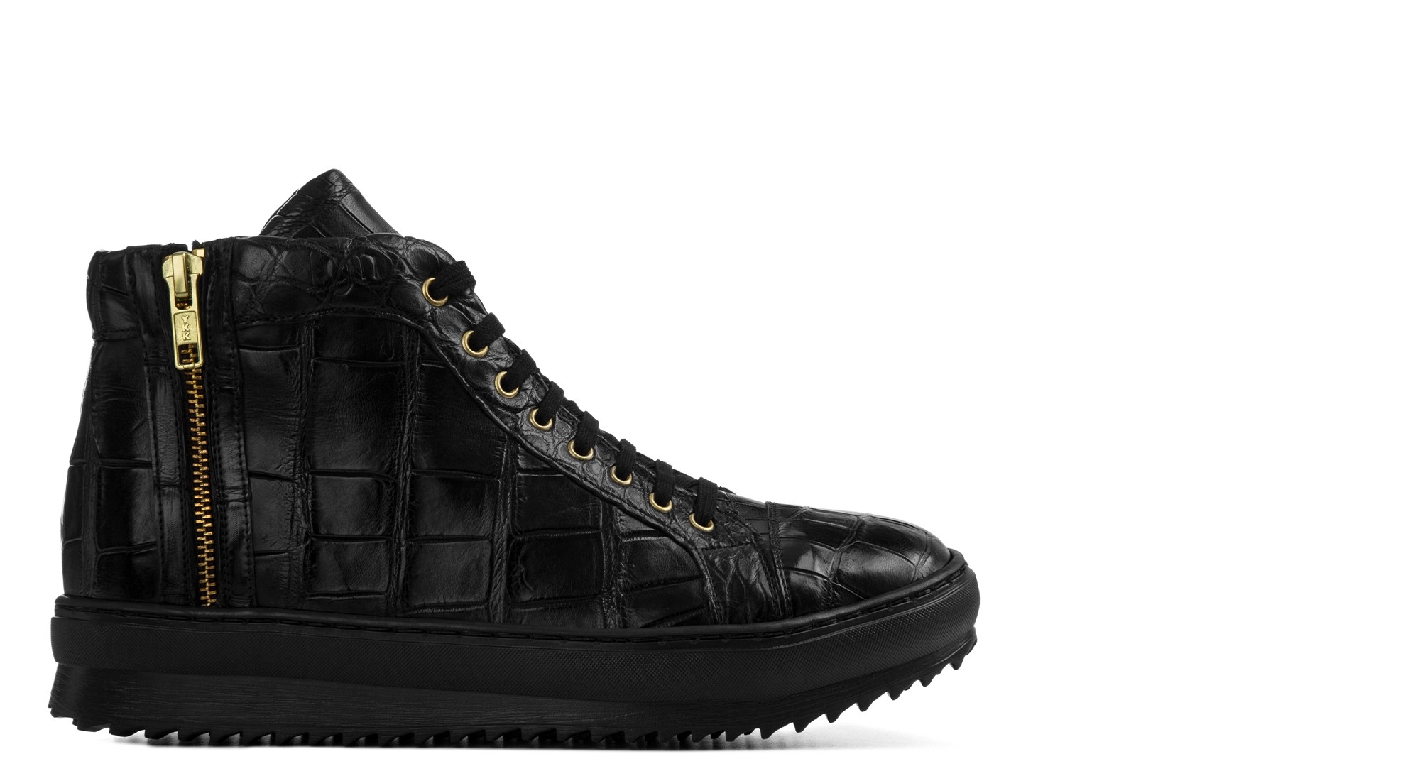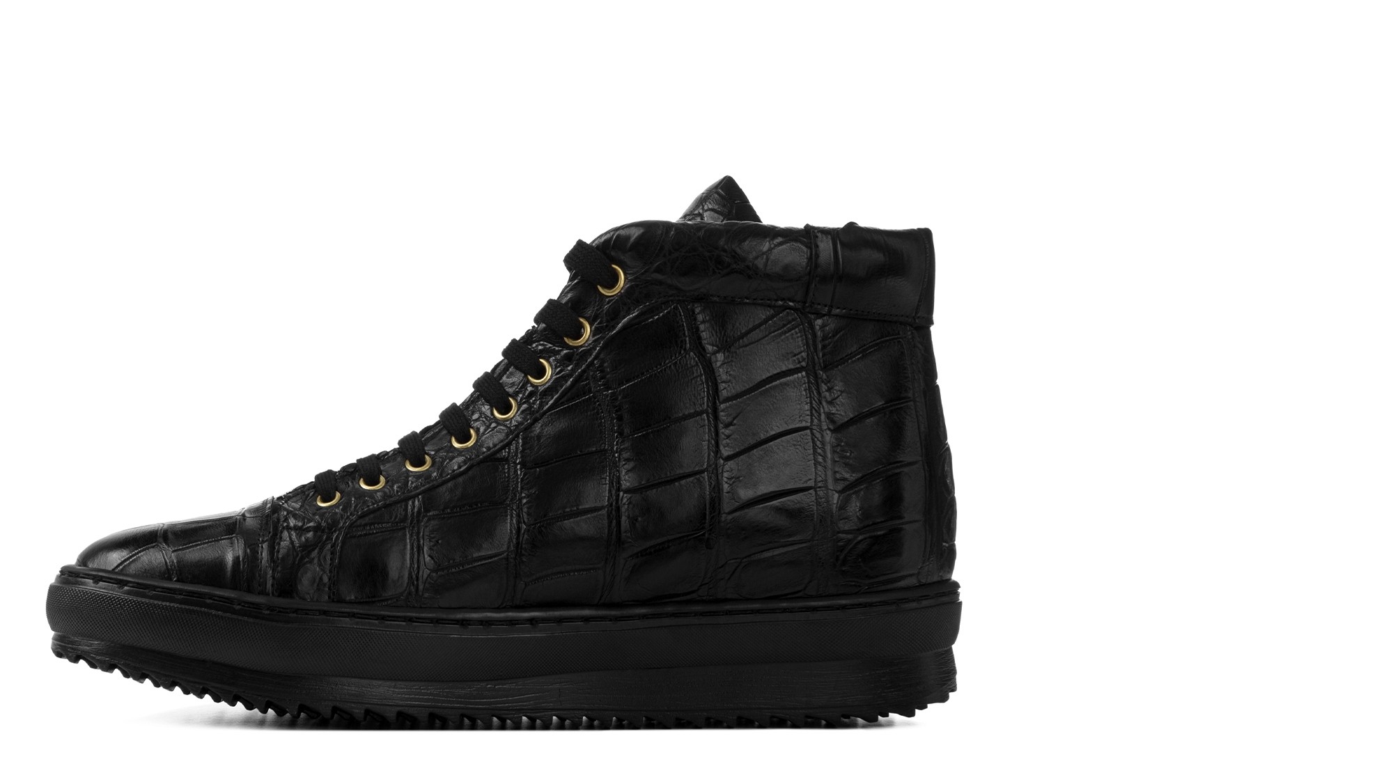 Basket montante artisanale réalisée en véritable cuir de crocodile. Précieuse et distinctive, elle est enrichie de détails dorés et de finitions haut de gamme.