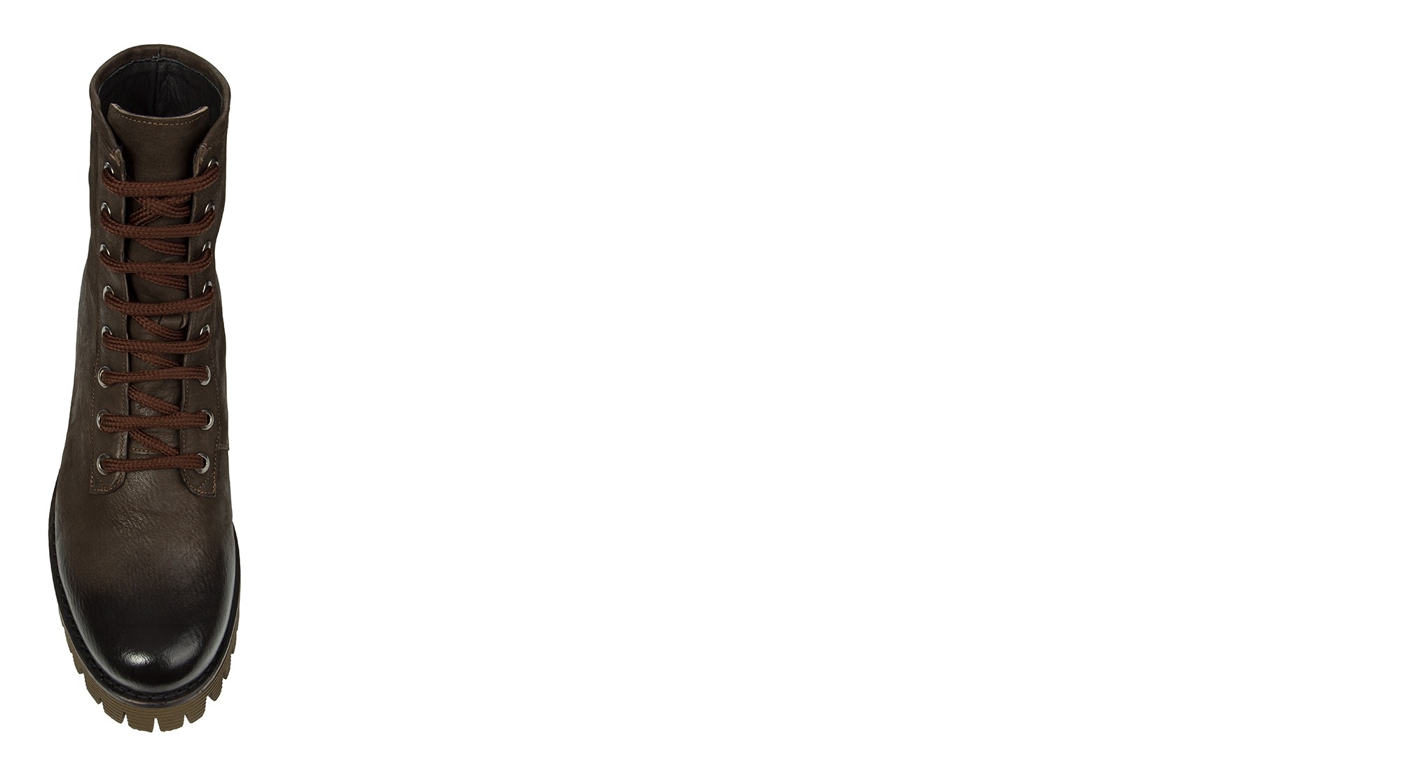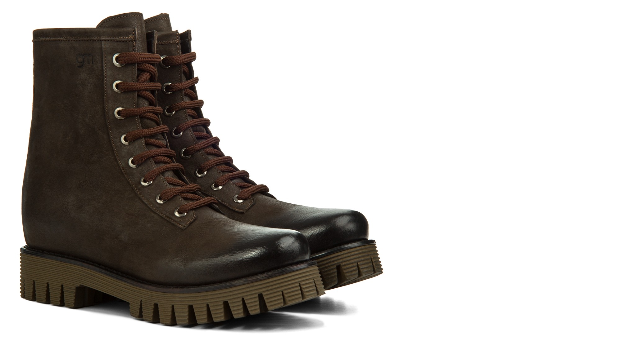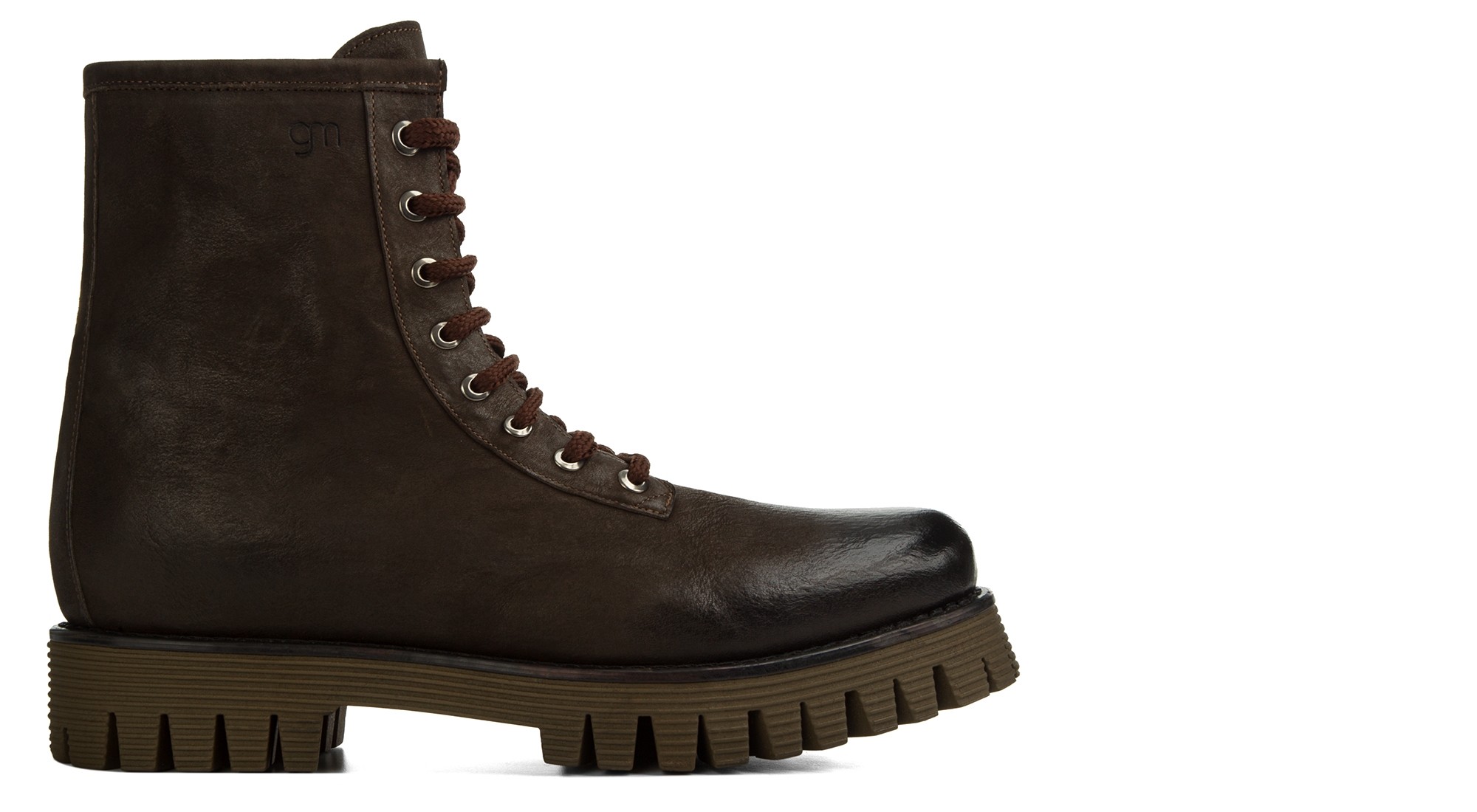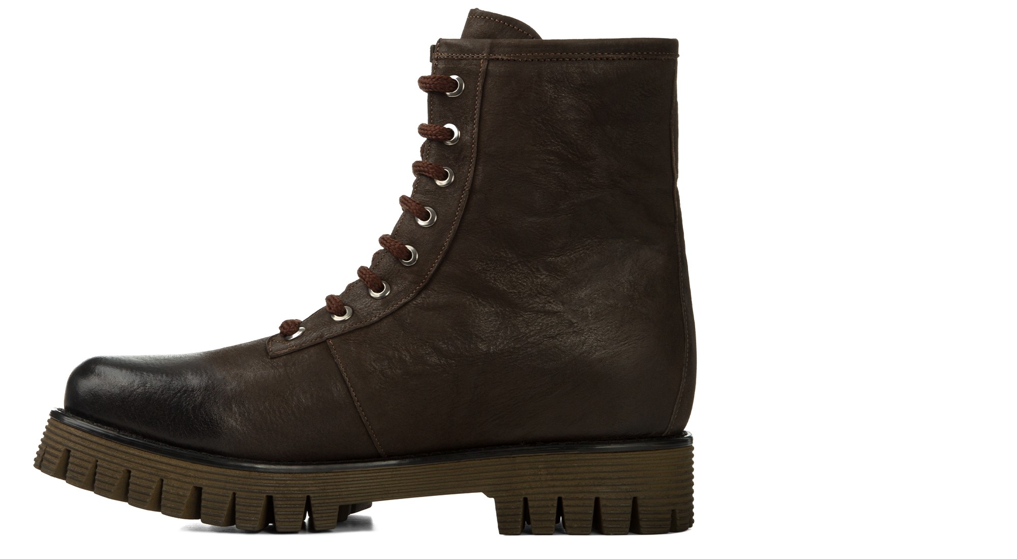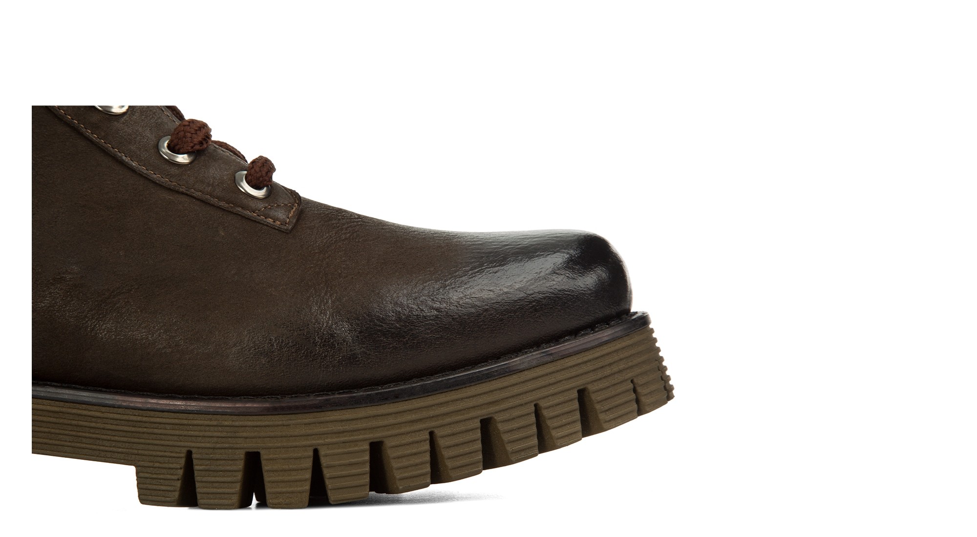 Botte réhaussante en cuir de veau ciré avec une texture marron particulière avec des nuances plus foncées sur la pointe qui renforcent son charme vintage. La semelle est en caoutchouc, crantée vert olive et assure un confort maximal.