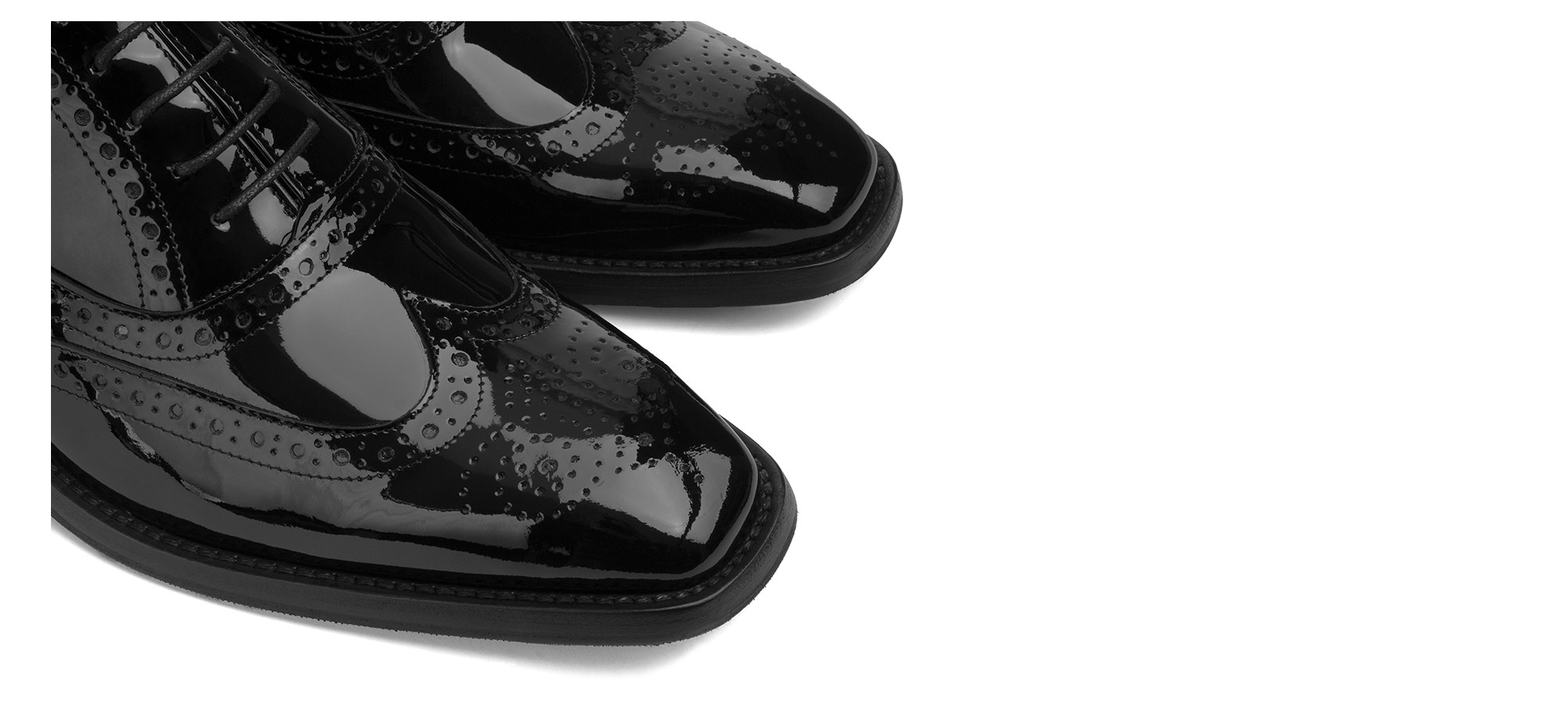 Modèle oxford rehaussants raffiné en cuir verni noir, aux lignes classiques et élégantes. Ajustement parfait pour une chaussure entièrement fabriquée à la main et adaptée par des maîtres artisans qualifiés.