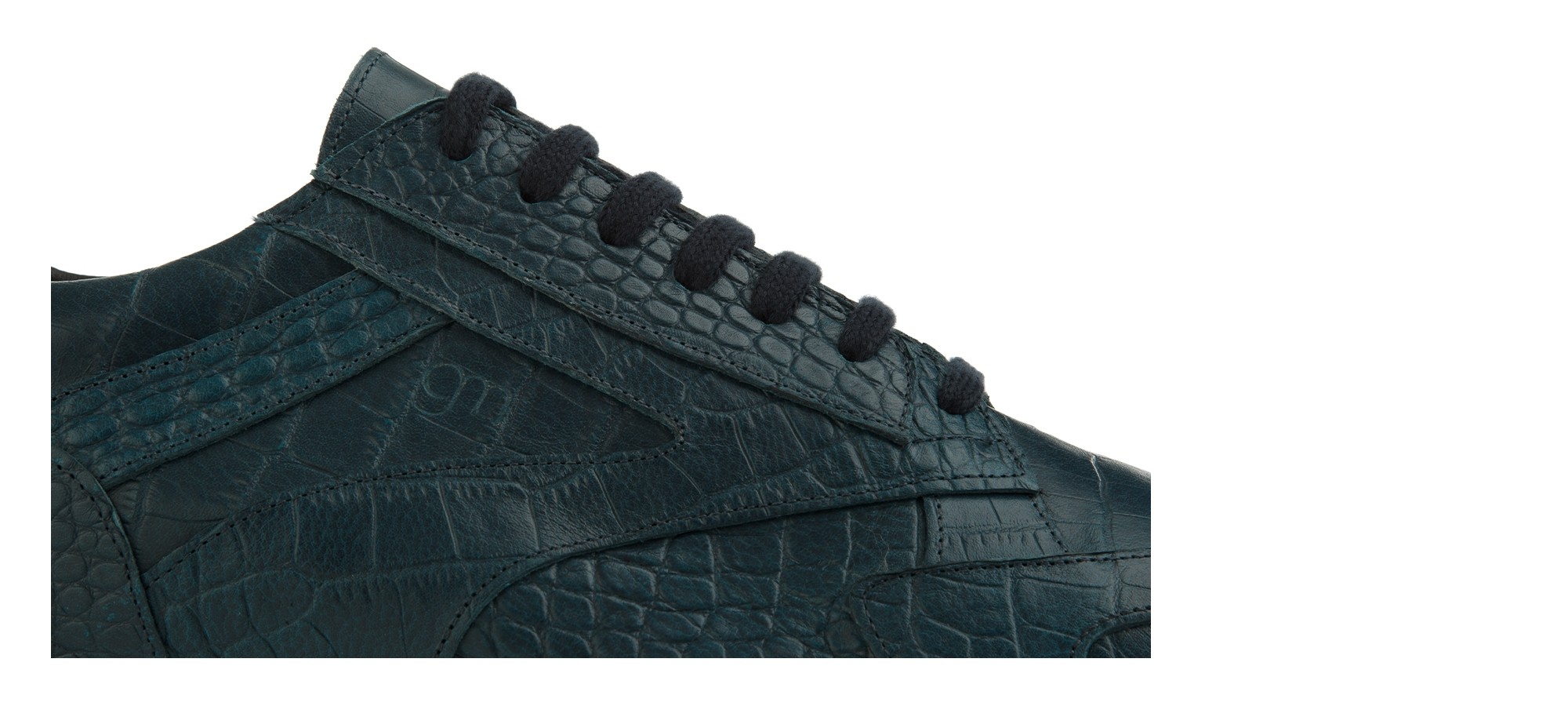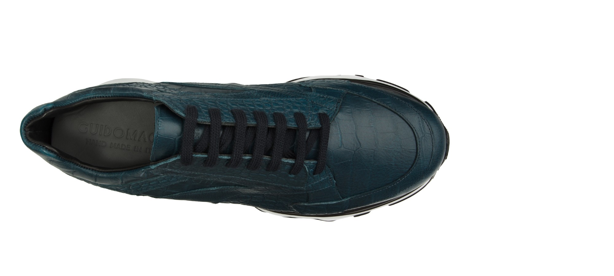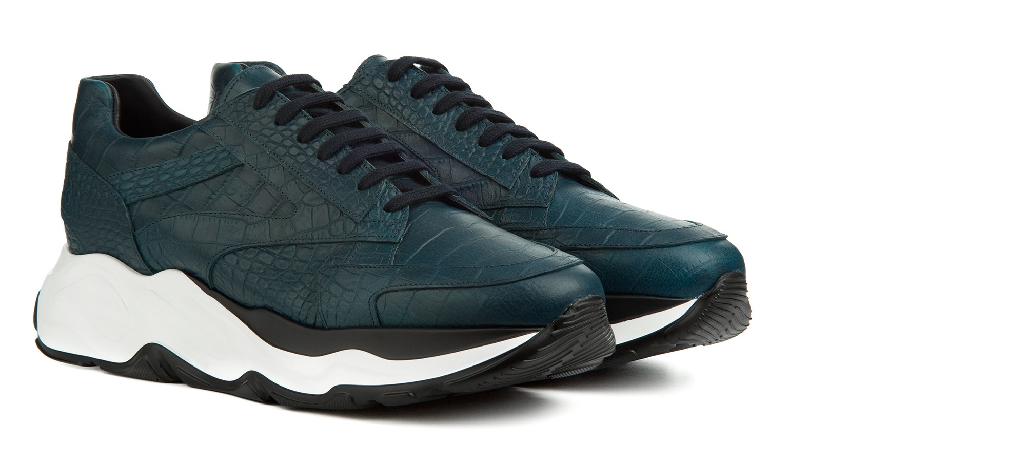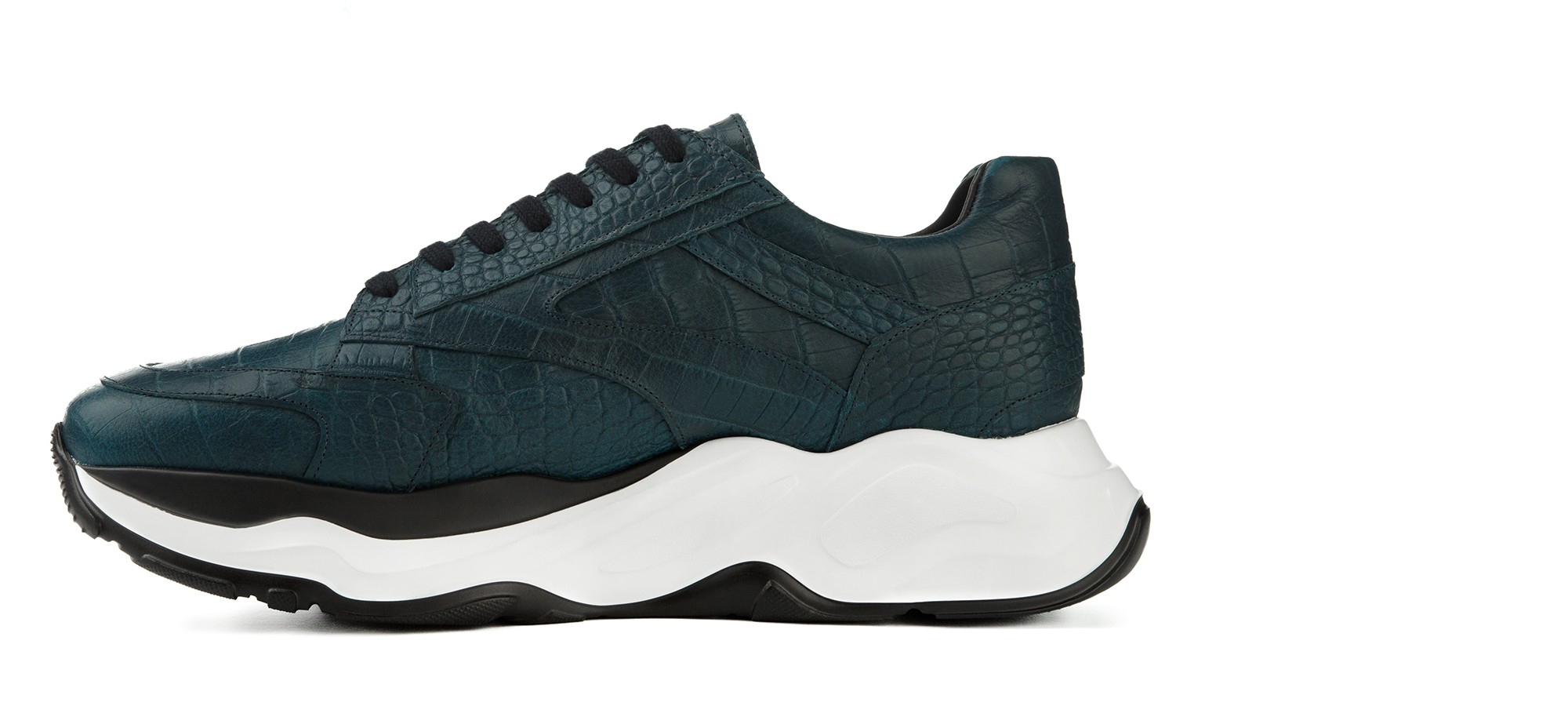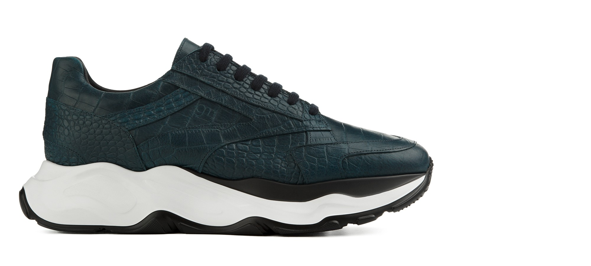 Sneaker au design contemporain avec semelle chunky ultra-légère, réalisée en cuir de veau effet crocodile de qualité dans des nuances raffinées de bleu.