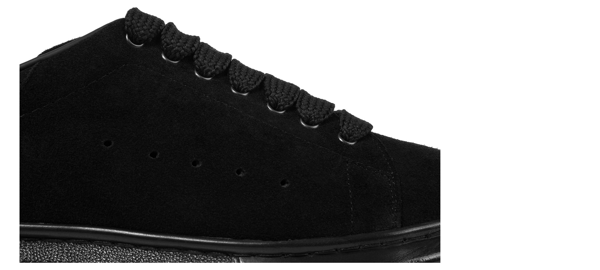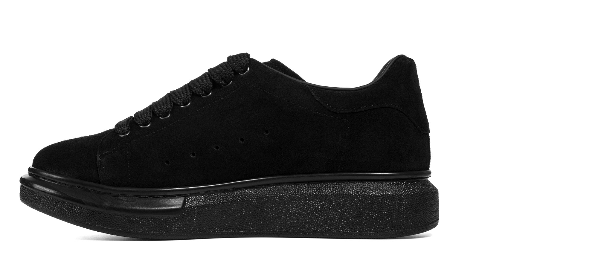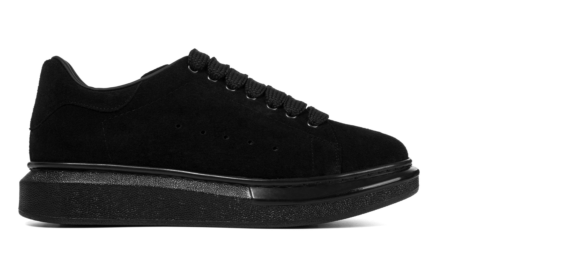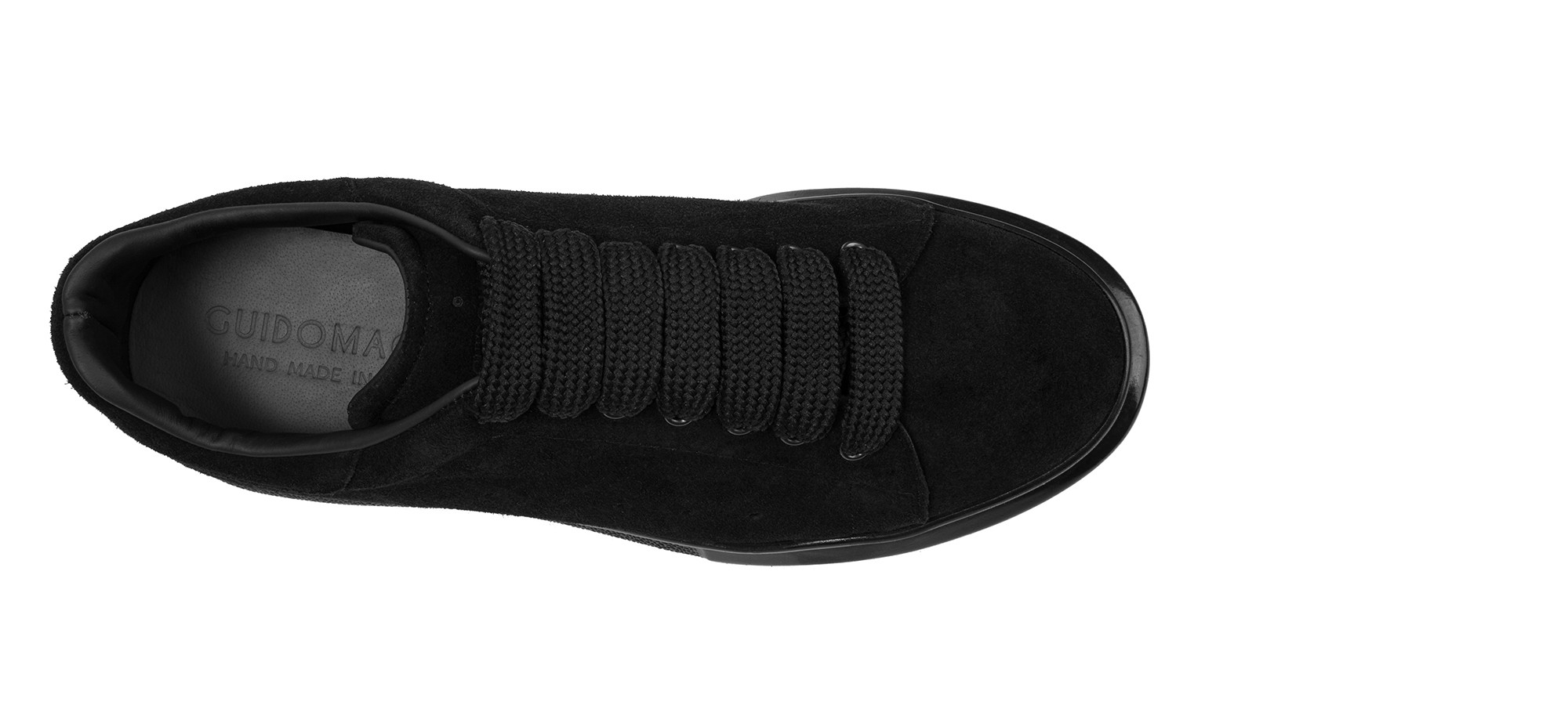 Sneaker artisanale au design contemporain dotée d'une tige en daim italien noir souple. Ce modèle total black se caractérise par une semelle oversize cousue main qui garantit légèreté et un confort exceptionnel tout au long de la journée. Parfaite pour toute occasion, elle allie un style urbain et minimaliste à une élégance discrète.