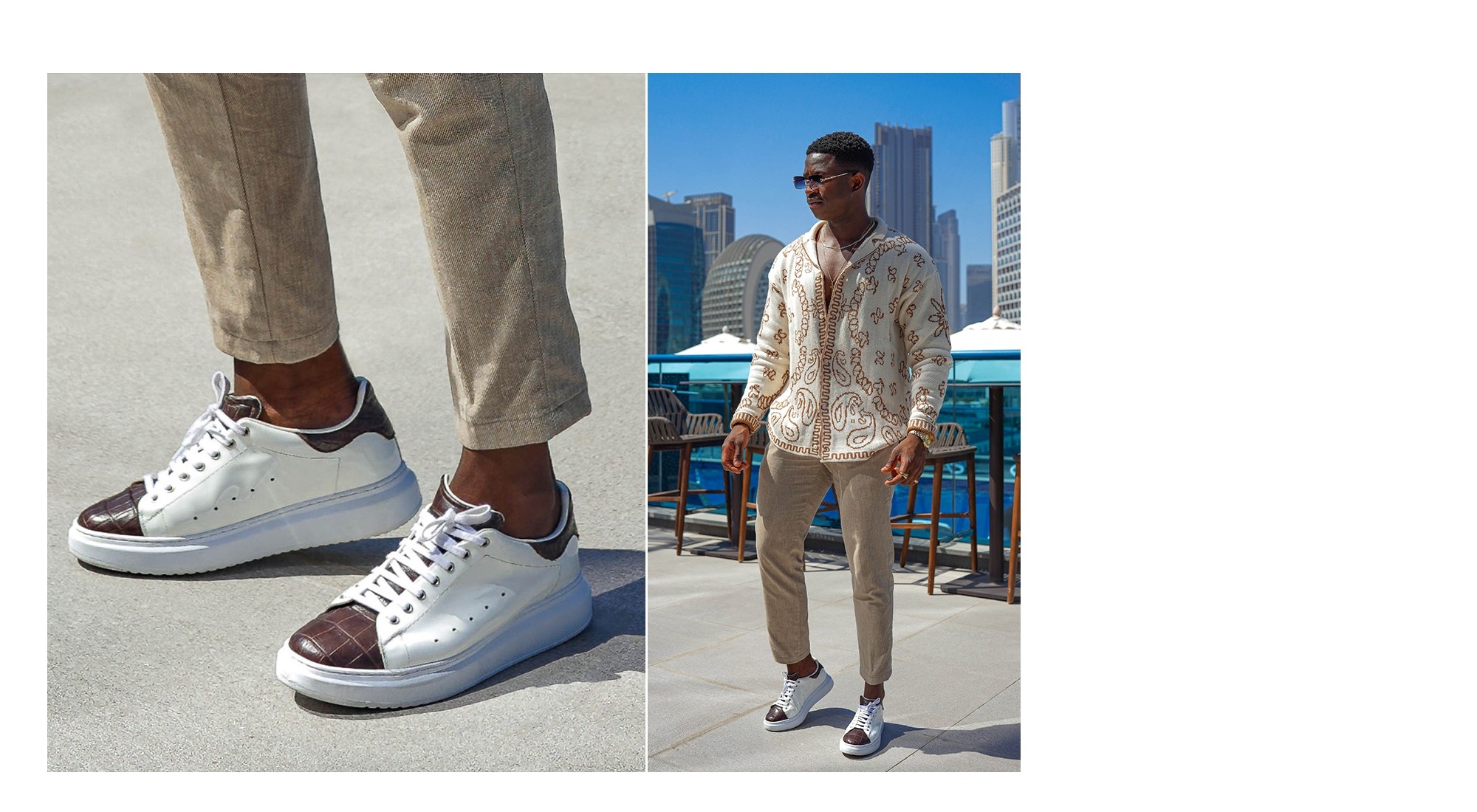 Baskets rehaussantes avec tige en cuir verni blanc et détails en cuir crocodile nabuk brun sur le bout, la languette et la patte de talon. Une chaussure extrêmement luxueuse, entièrement réalisée à la main, qui allie élégance et décontraction grâce à un design classique et raffiné. Le système d'élévation interne permet d'augmenter la hauteur de 6 à 8 cm.