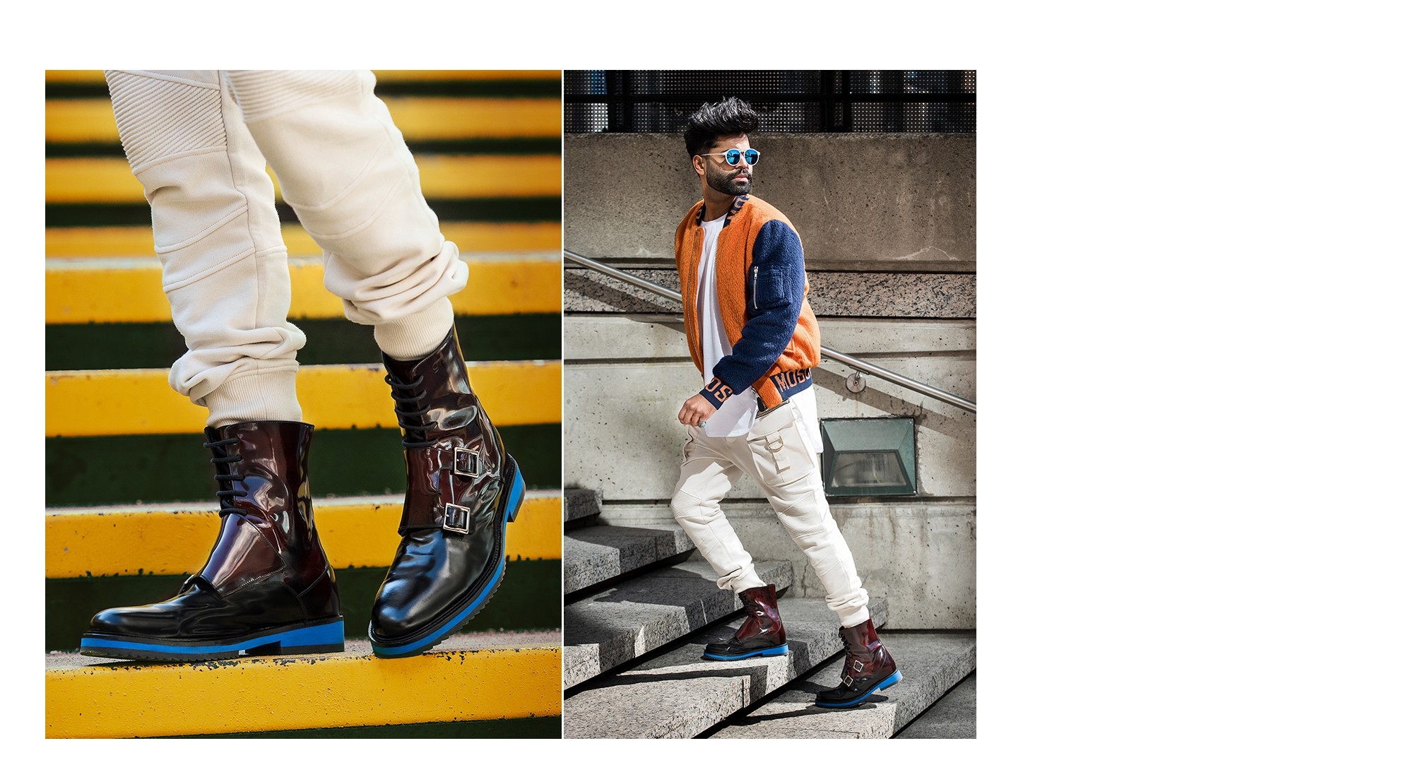 • Empeigne en peau de veau (bordeaux et noir, aspect brillant)