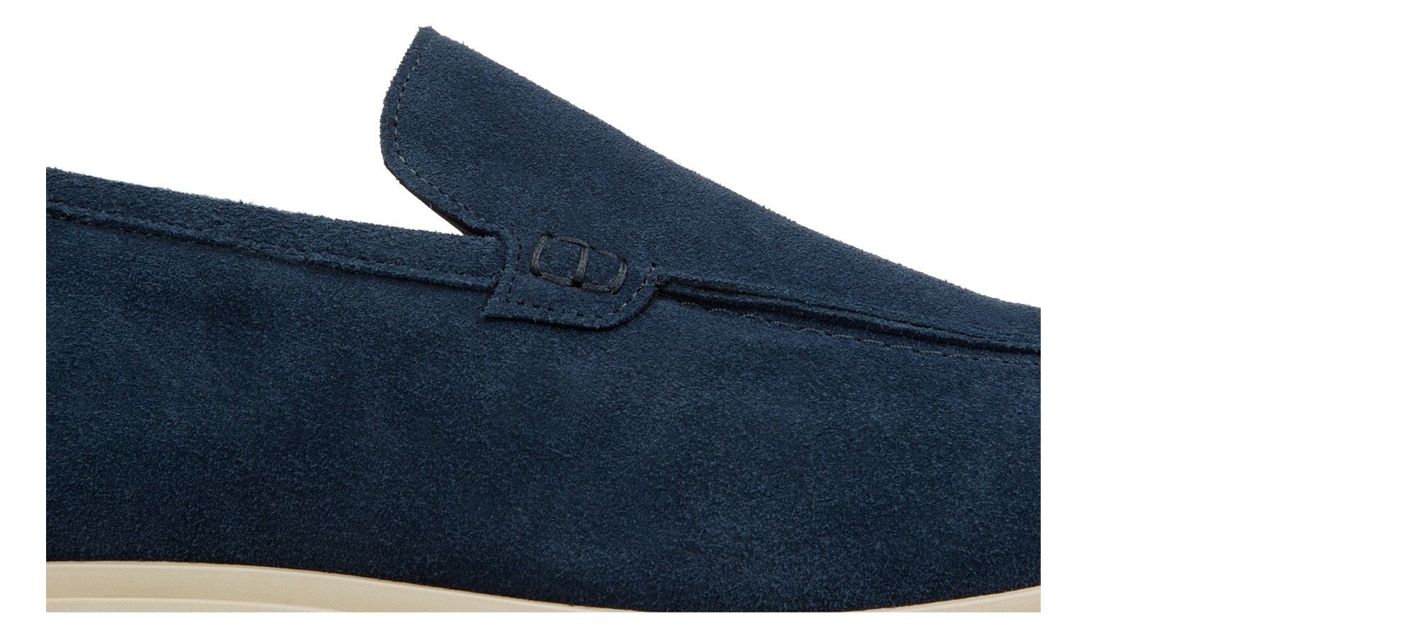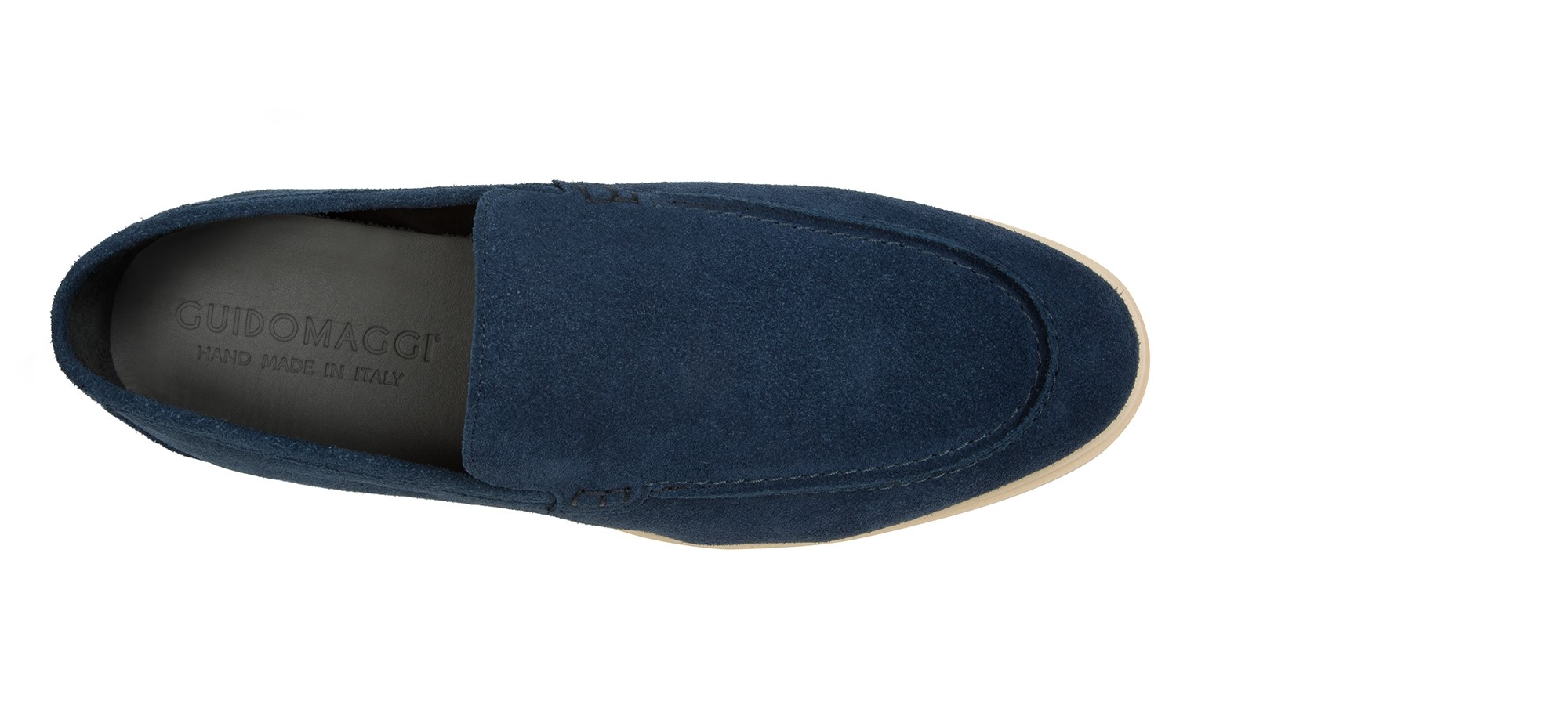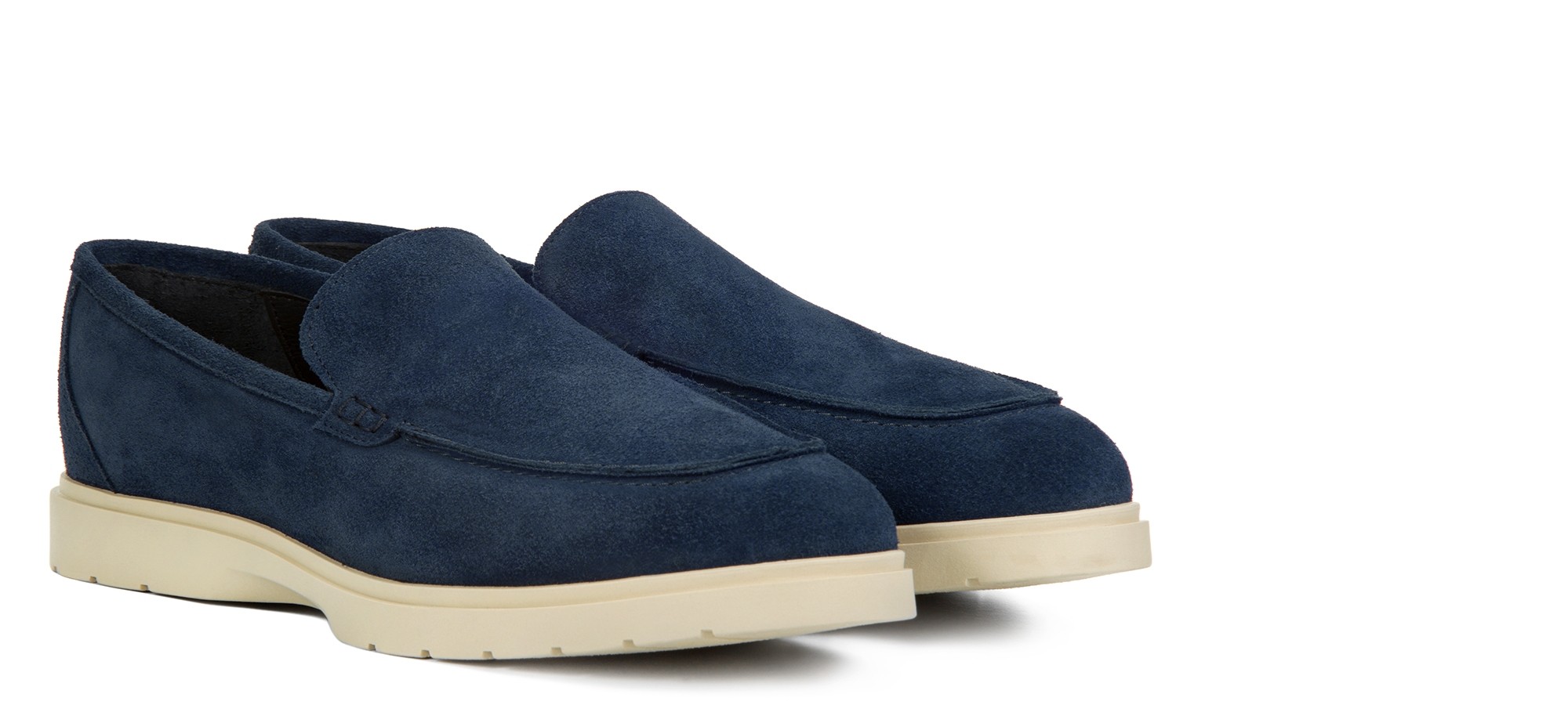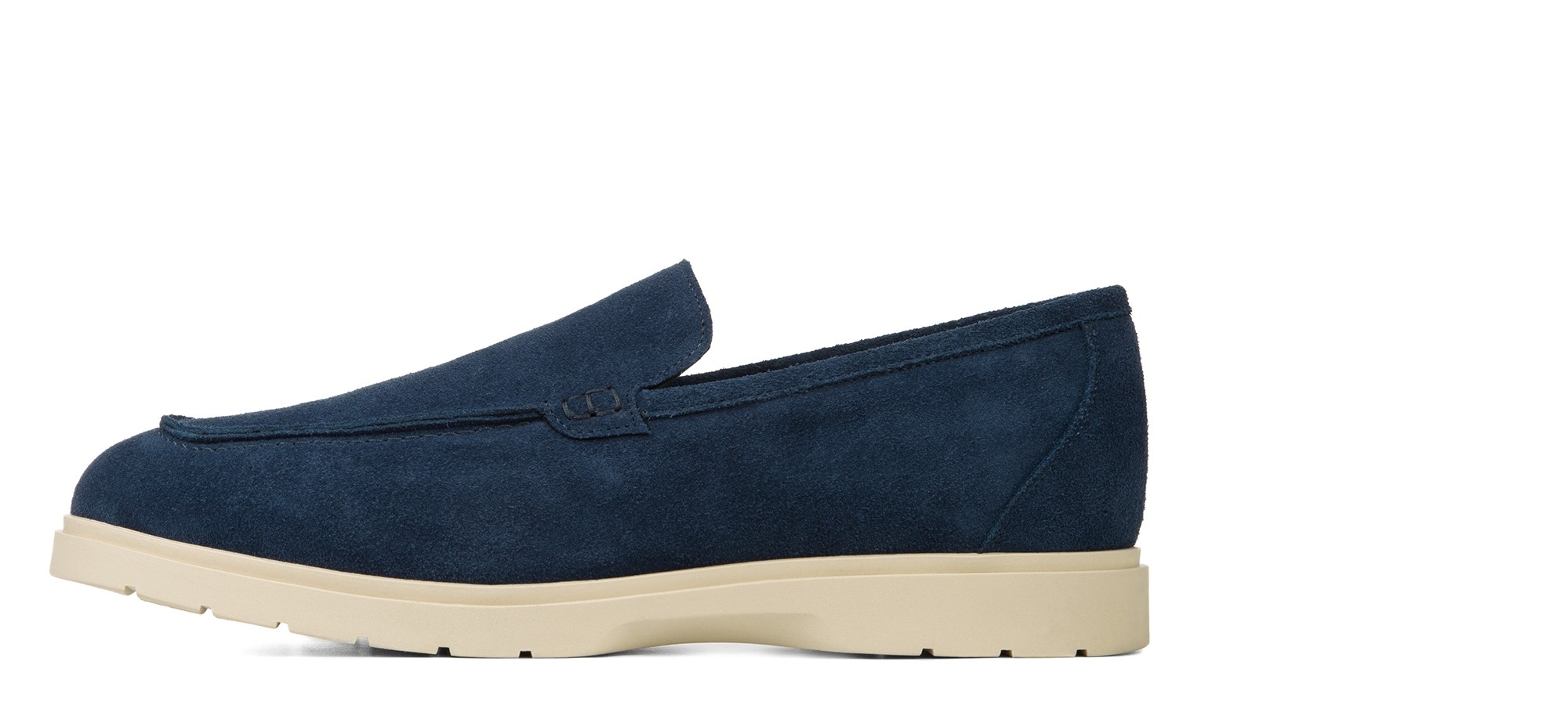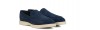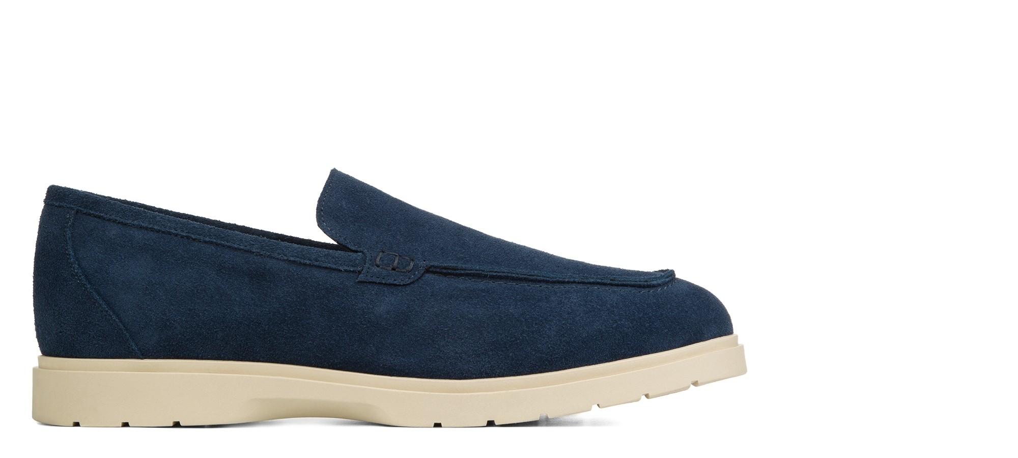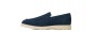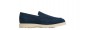 Mocassin rehaussant artisanal confectionné dans un daim haut de gamme d'une nuance de bleu unique et profonde. Caractérisé par une construction tubulaire raffinée entièrement cousue à la main, il offre un look décontracté-chic intemporel. La semelle en caoutchouc crème, légère et flexible, crée un élégant contraste chromatique tout en garantissant un confort maximal.