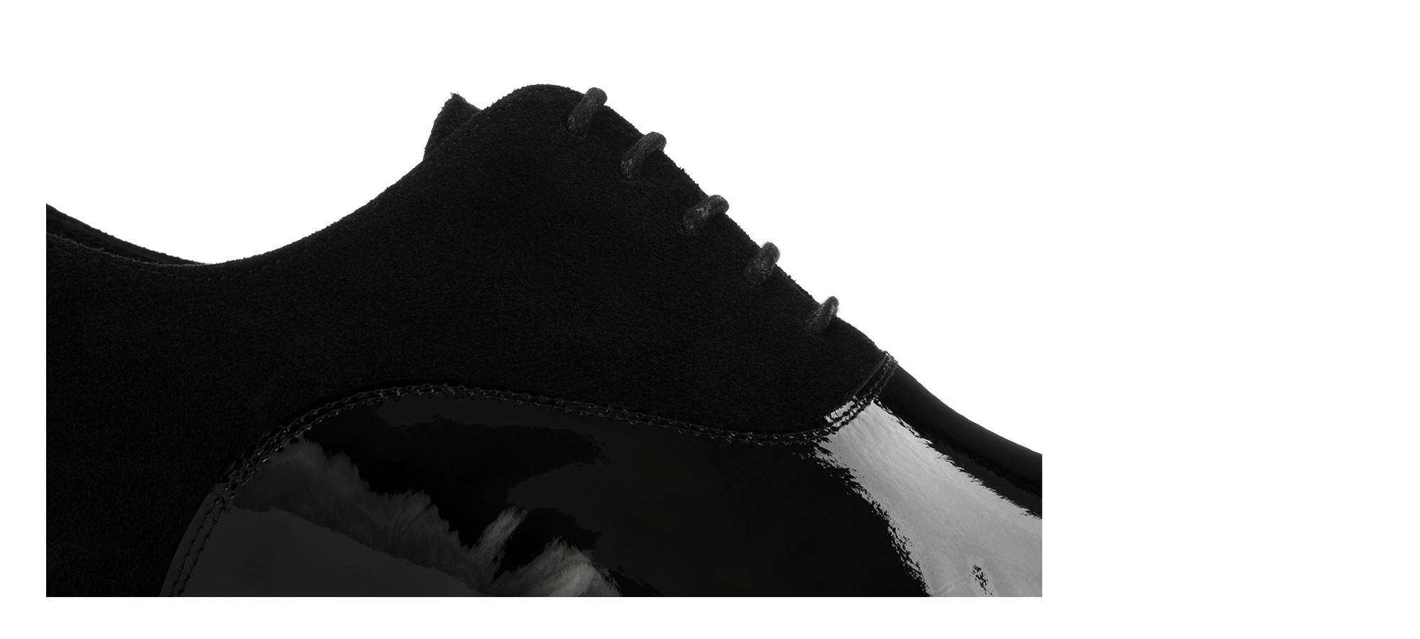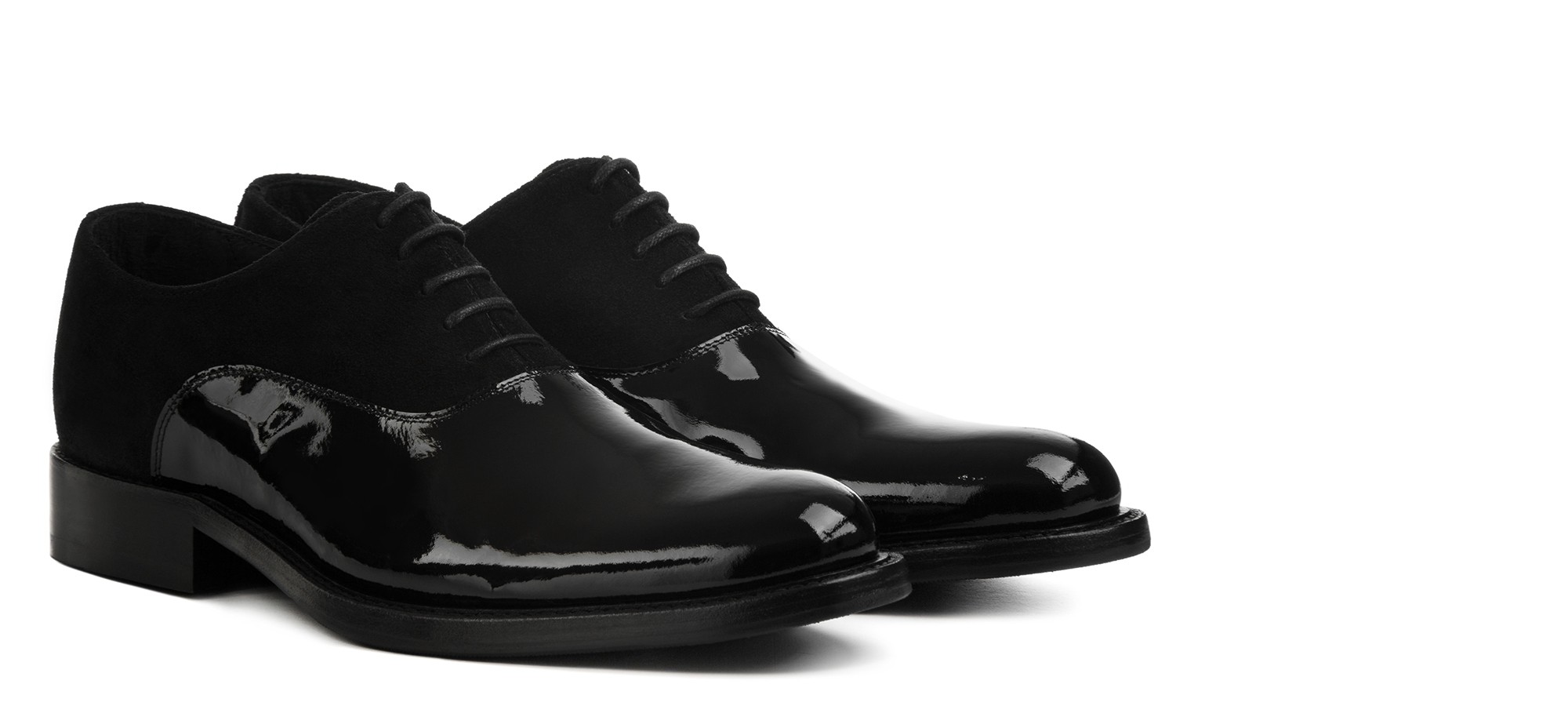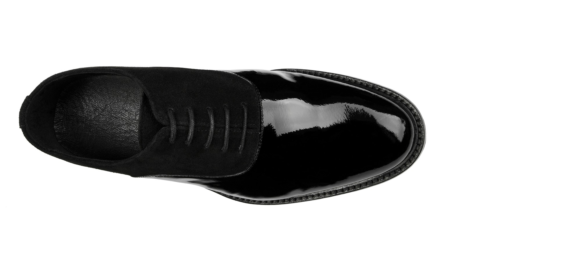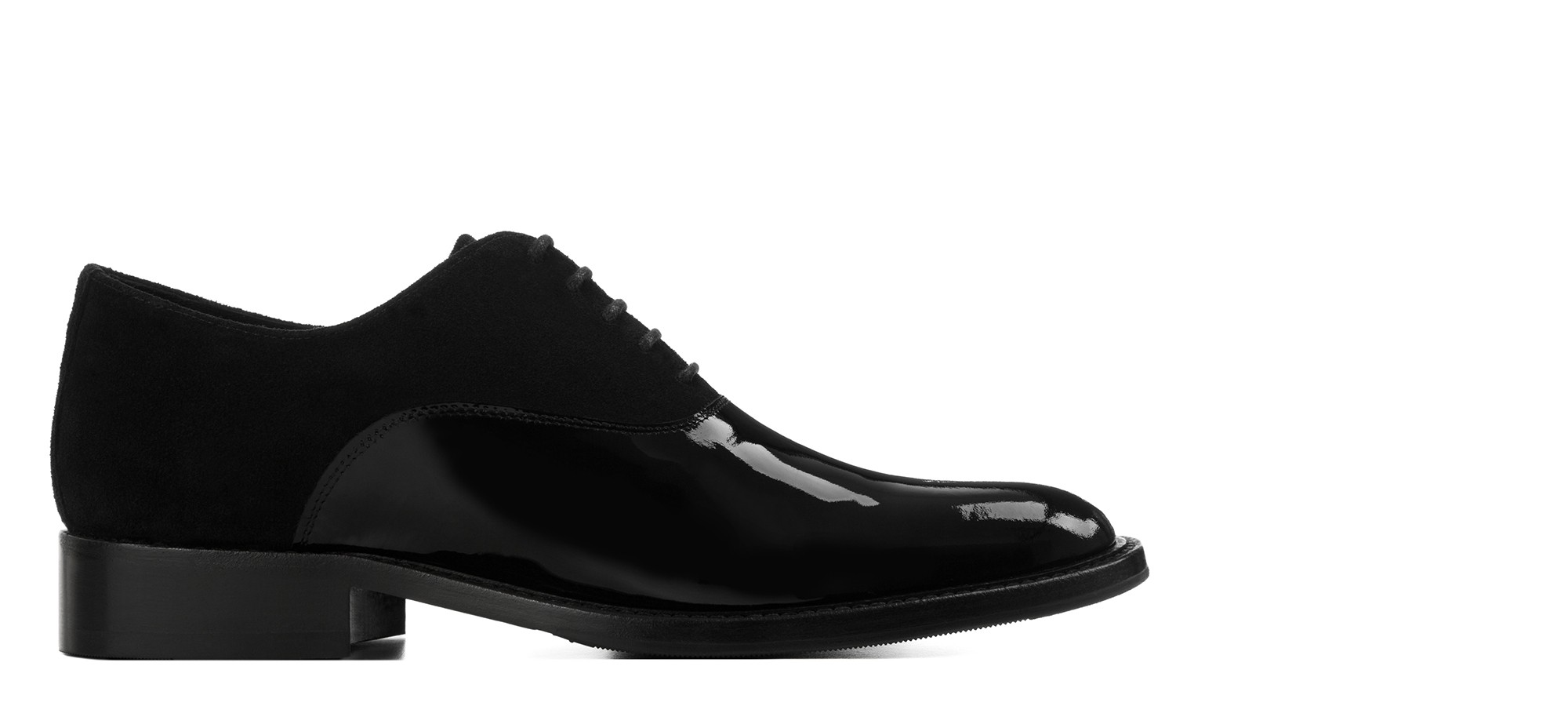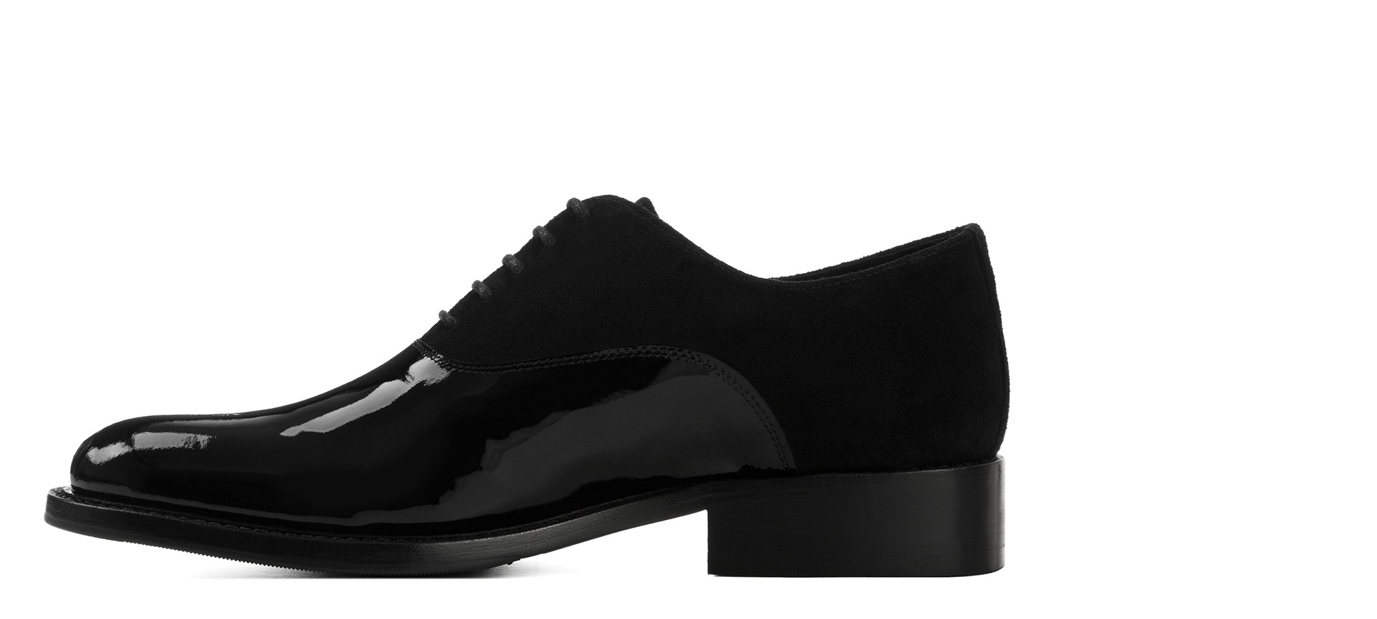 Soulier classique artisanal raffiné qui mélange savamment différentes textures pour un résultat d'une élégance extrême. La tige en daim noir souple est sublimée par un bout rapporté en cuir verni brillant, créant un contraste sophistiqué parfait pour les occasions formelles et les cérémonies. La semelle est en 100% cuir véritable, garantissant qualité et durabilità.