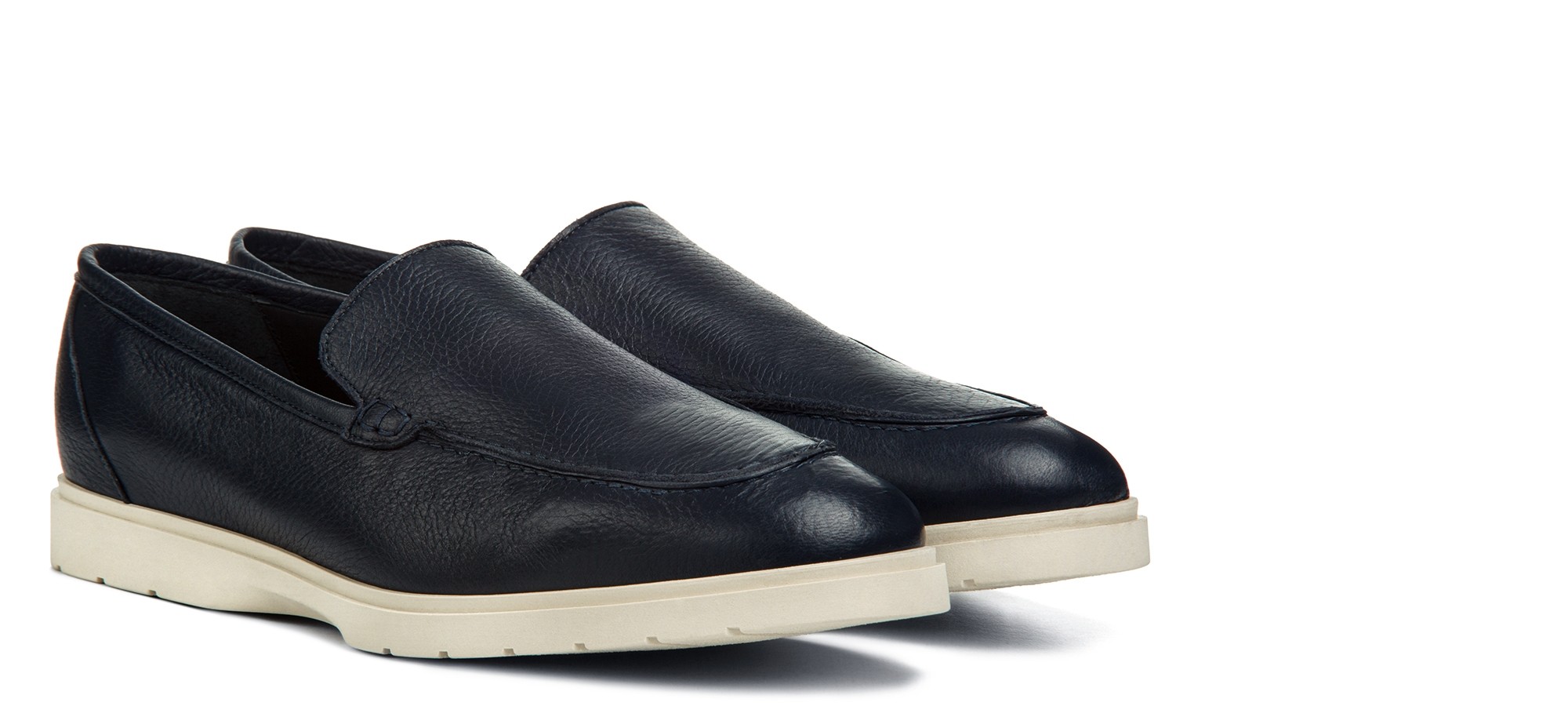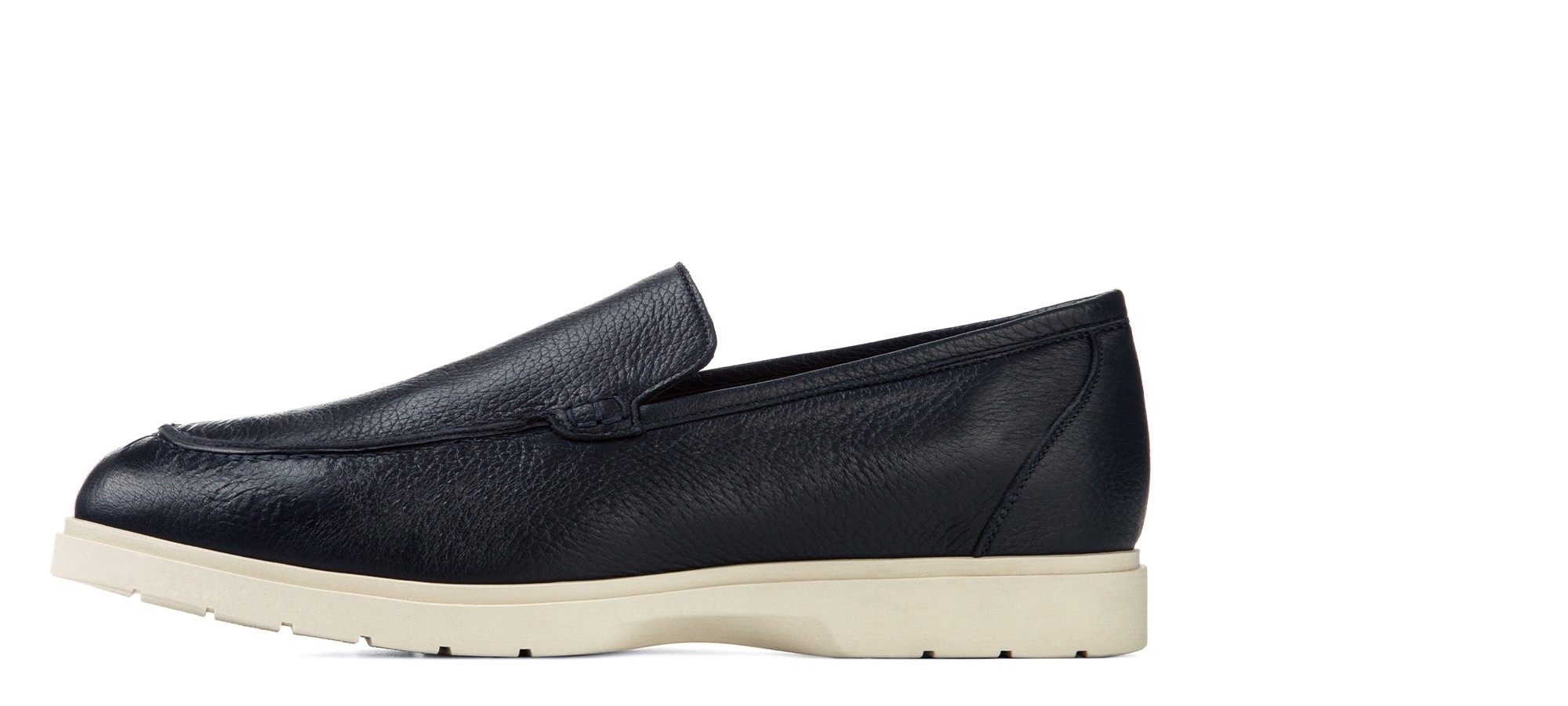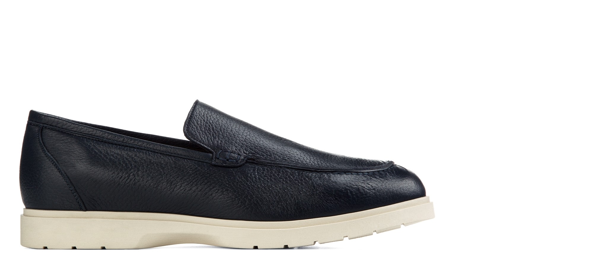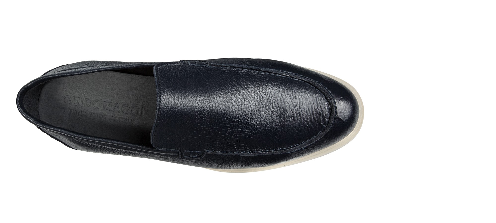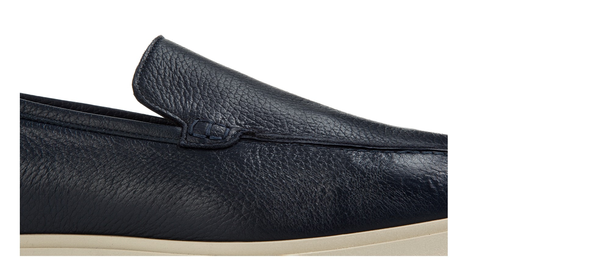Mocassin rehaussant en cuir de cerf ultra-souple dans une nuance de bleu magnétique. Un chef-d'œuvre de légèreté et de qualité, caractérisé par le grain naturel du cuir le plus fin.