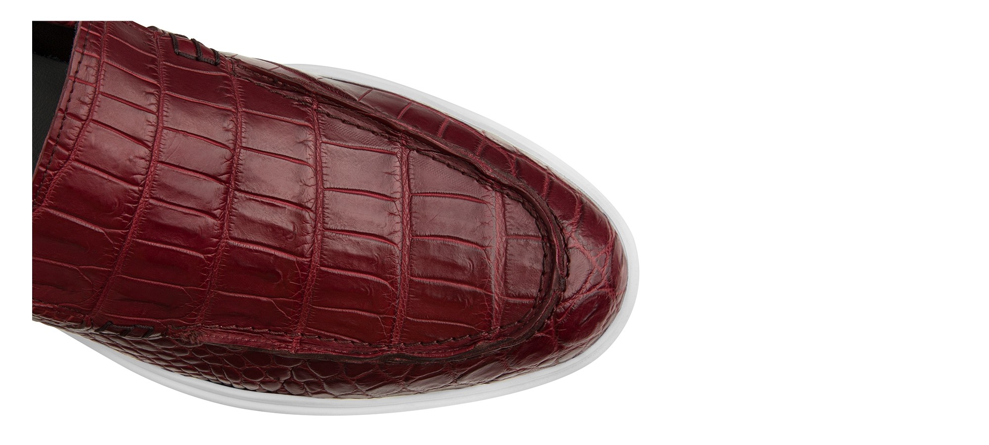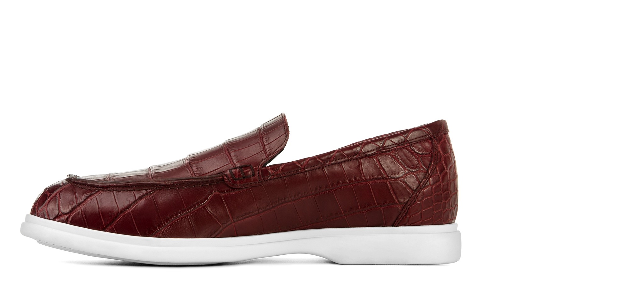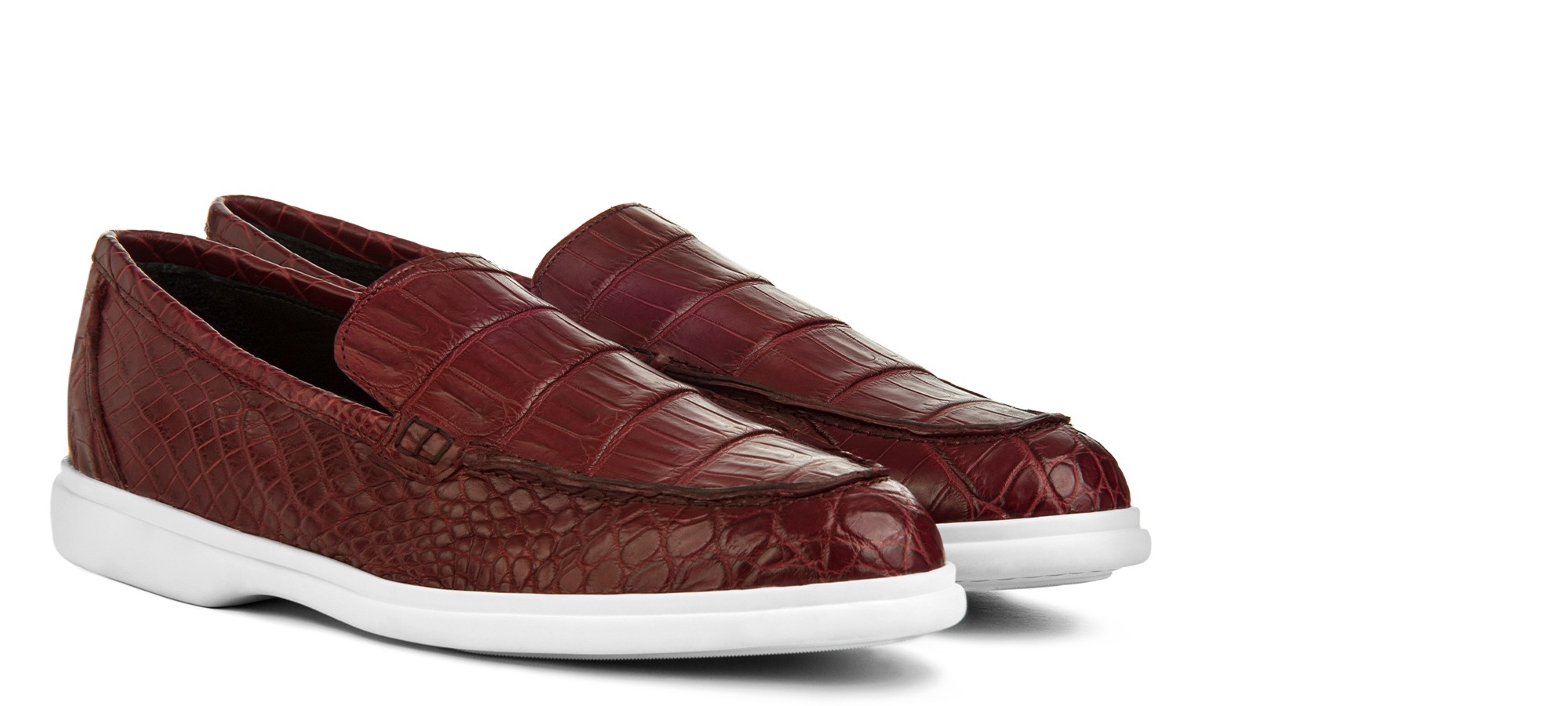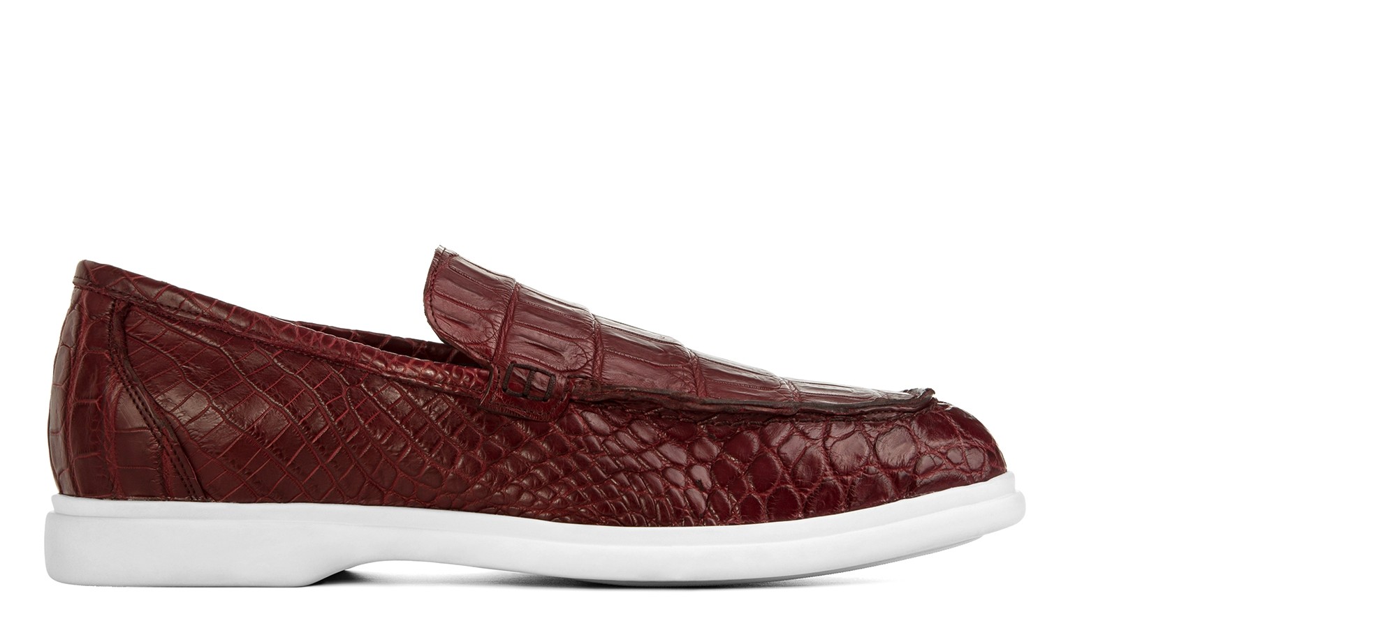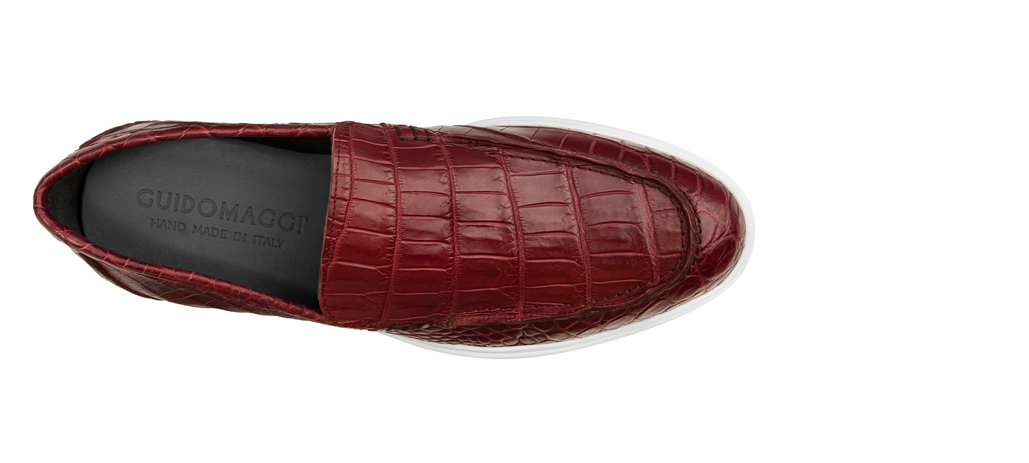 Élégant mocassin artisanal Guidomaggi, entièrement fabriqué à la main avec une tige en cuir d'alligator véritable haut de gamme aux nuances rouges intenses. La texture distinctive de l'alligator exotique sublime l'essence sartoriale et la maîtrise artisanale de la marque. La semelle confortable et légère le rend parfait pour toute occasion importante.
