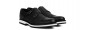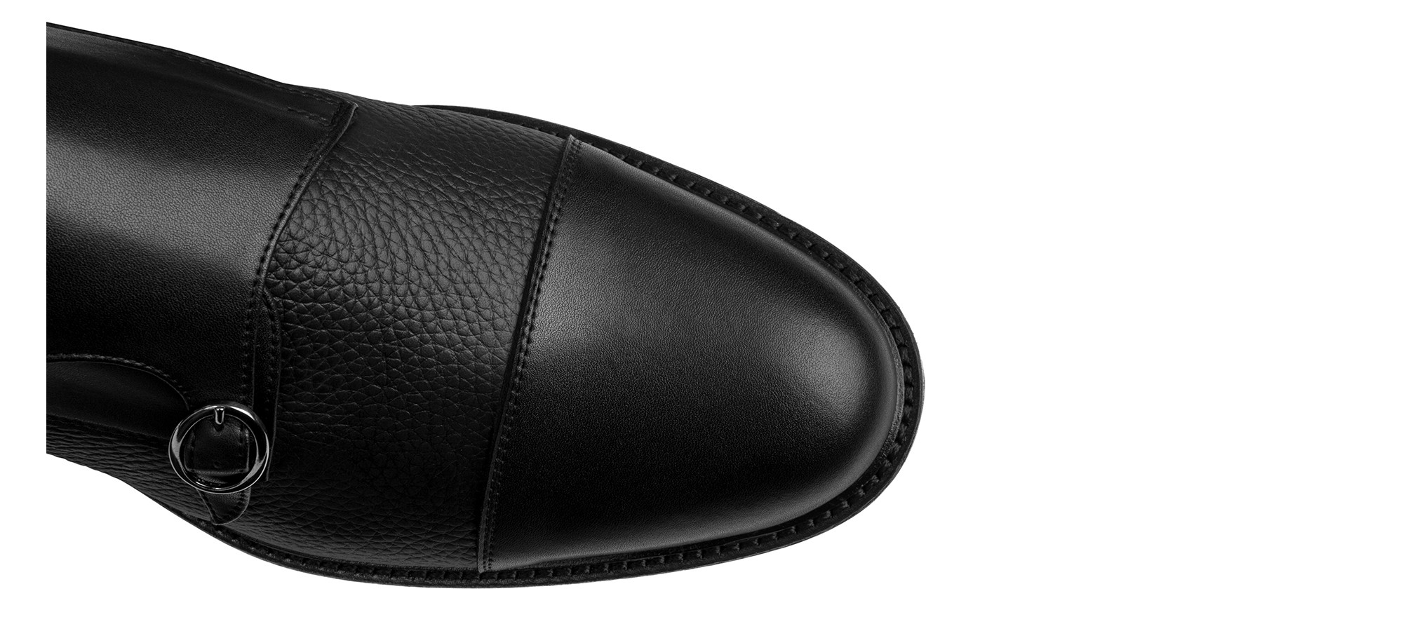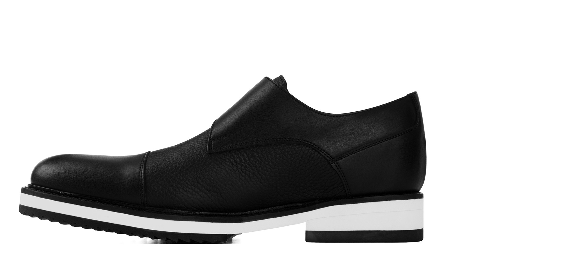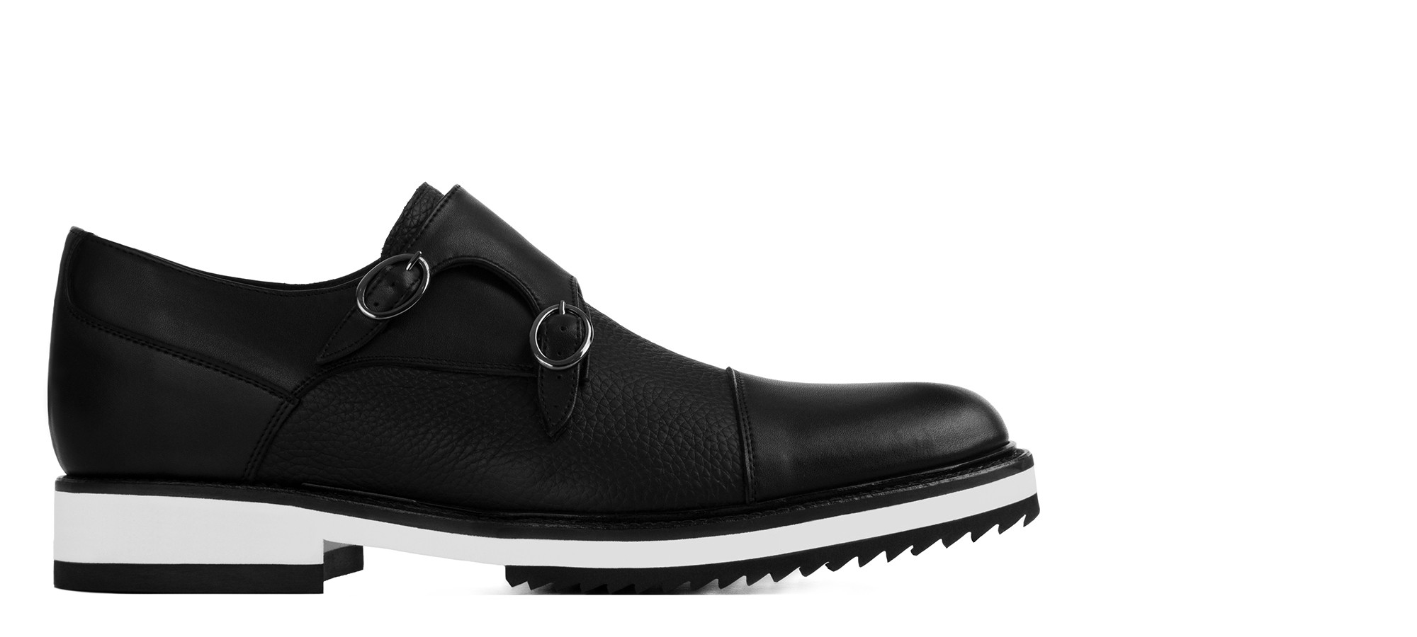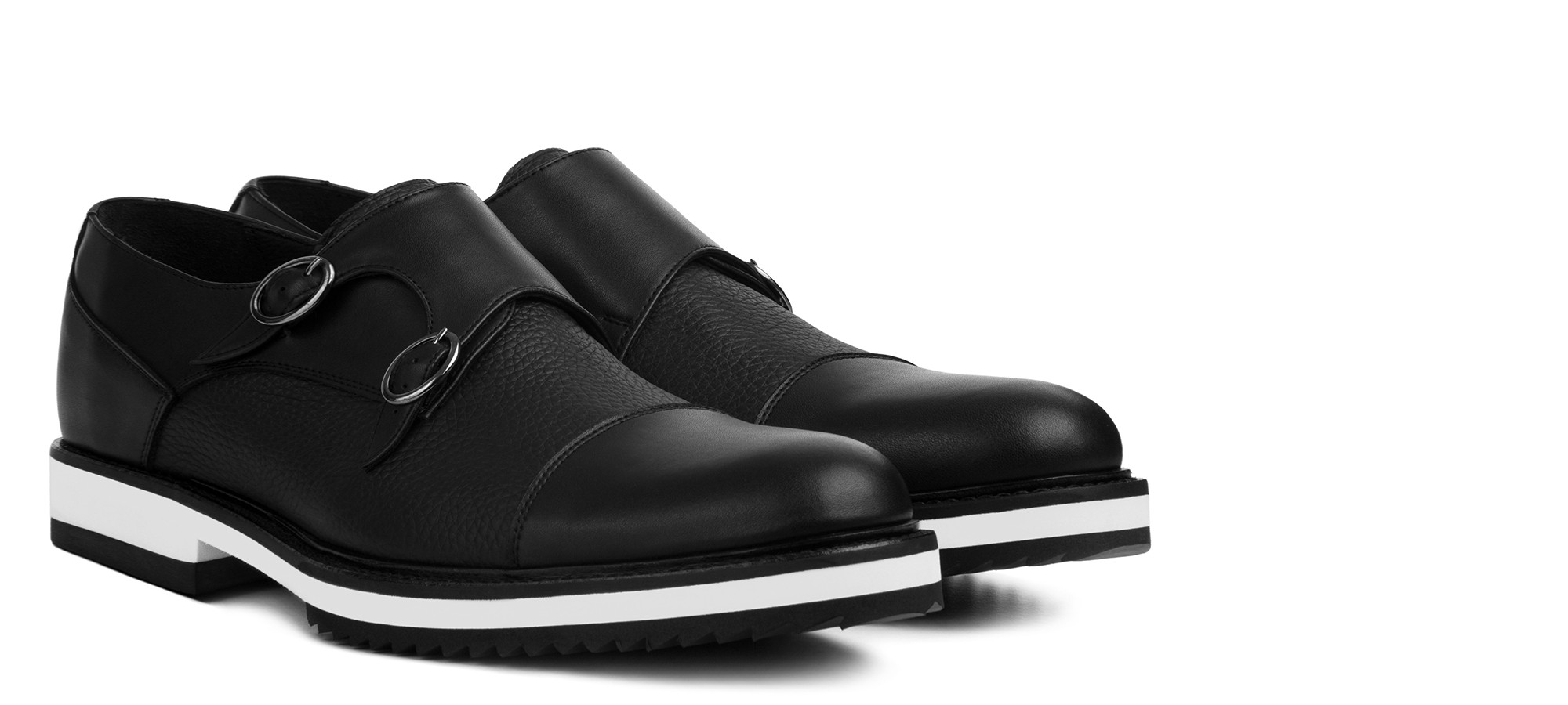 Élégante Derby à double boucle avec bout rapporté, fabriquée à la main en cuir pleine fleur noir de première qualité. Un modèle classique revisité avec une touche contemporaine grâce à sa semelle distinctive en caoutchouc naturel antidérapant avec insert contrasté noir et blanc, offrant à la chaussure un caractère audacieux et raffiné.