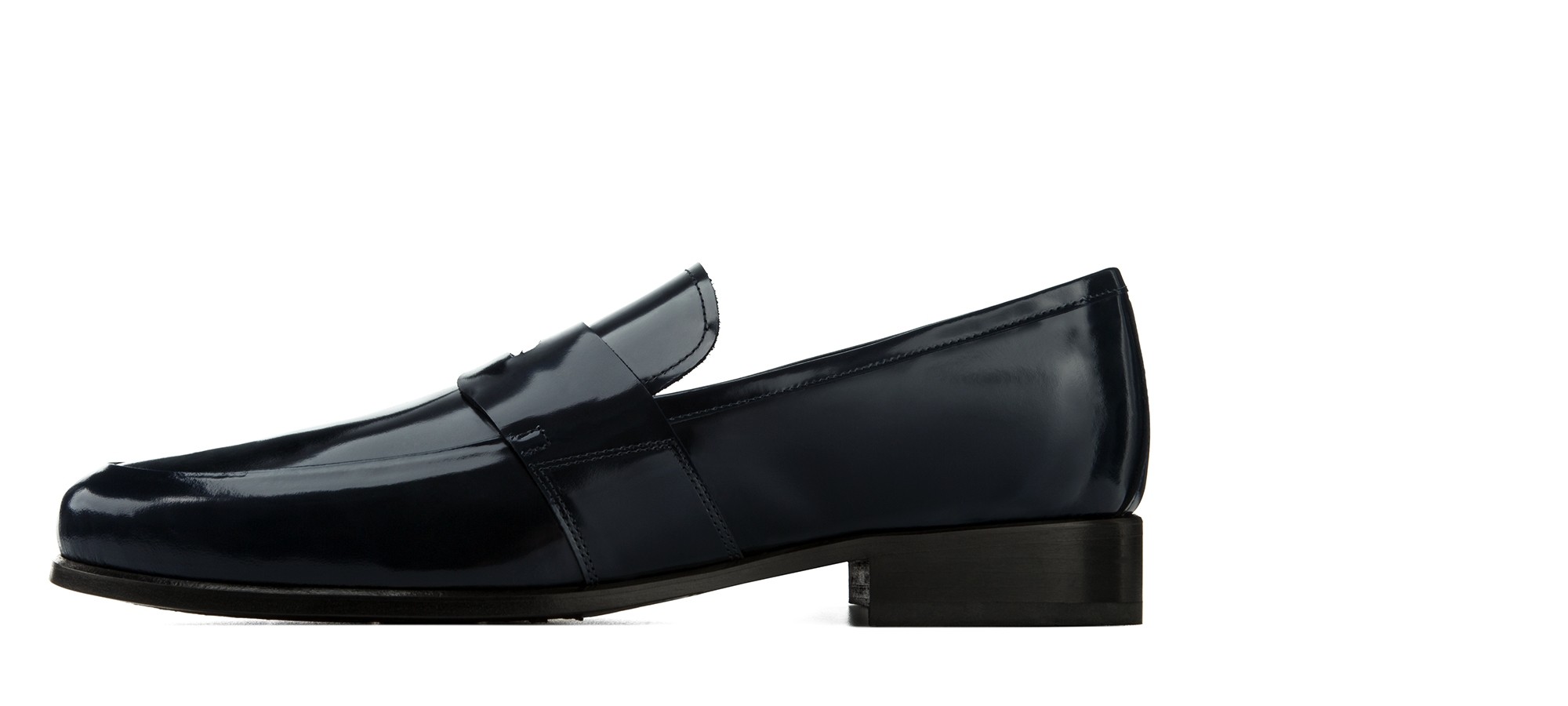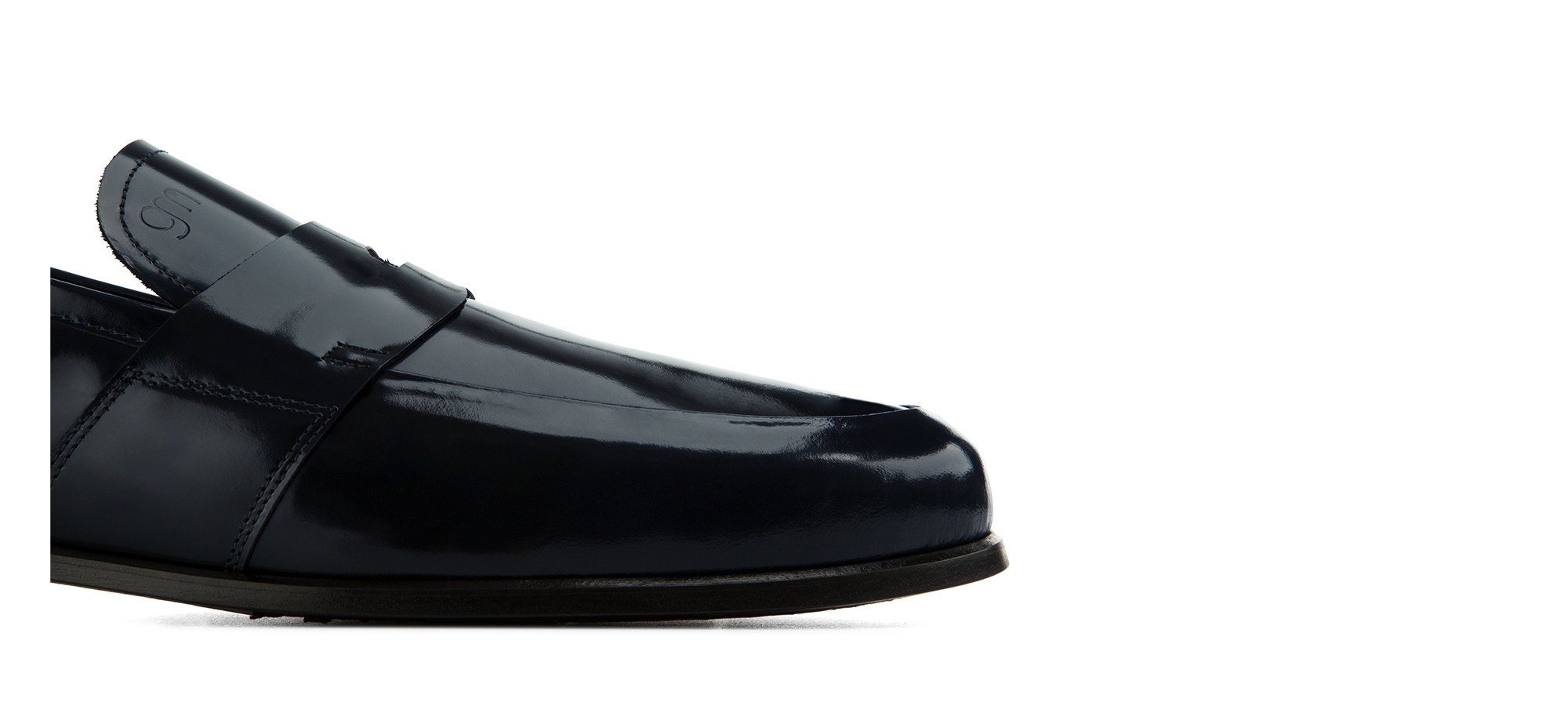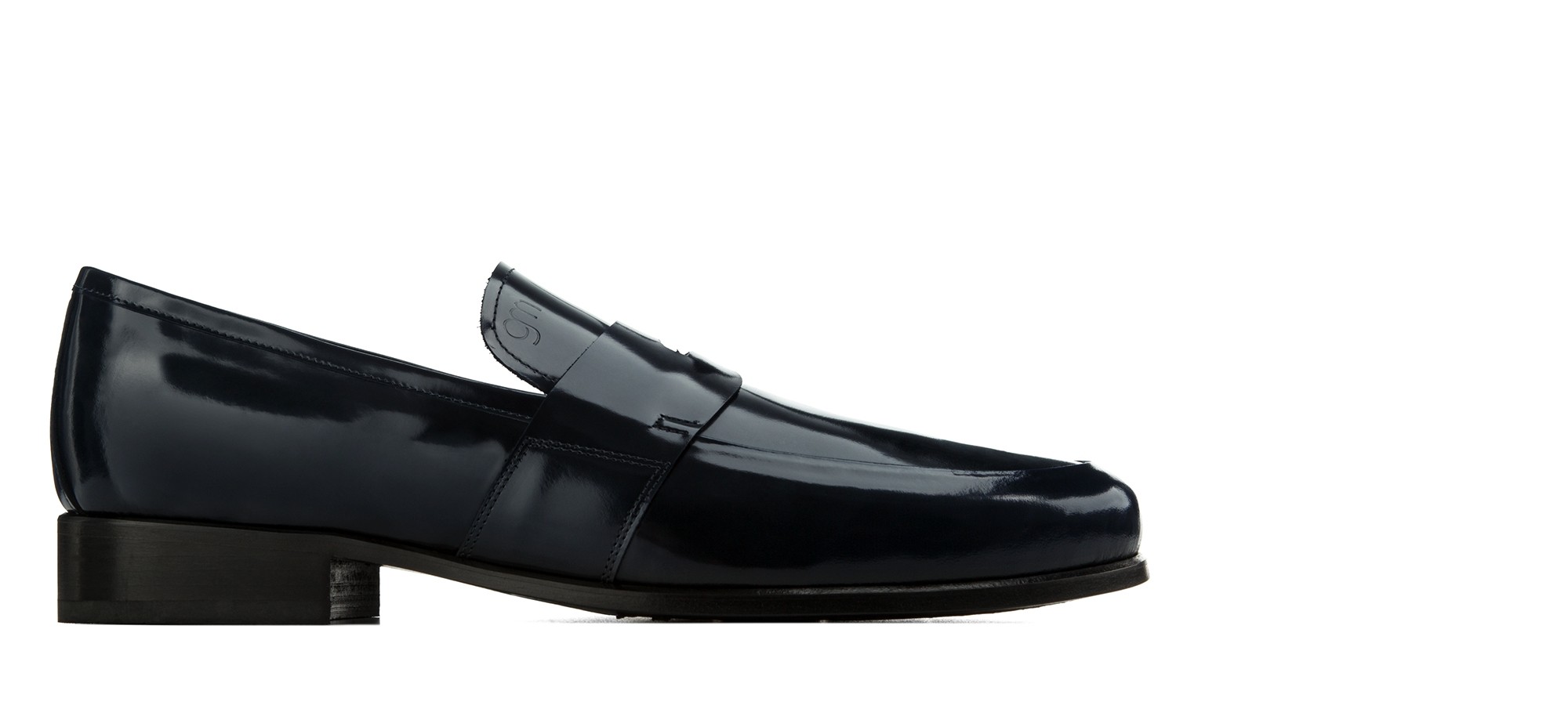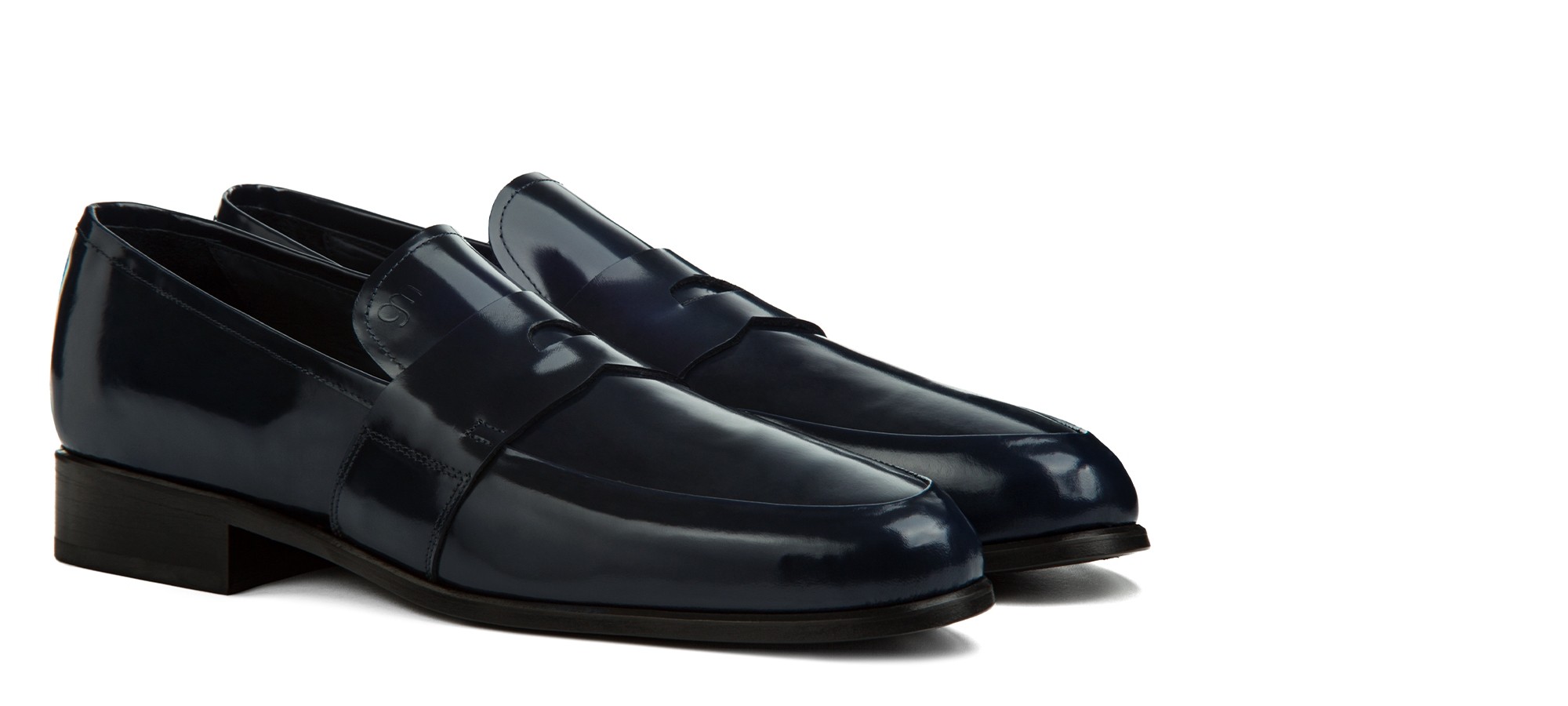 Mocassin élégant fabriqué à la main en cuir de veau bleu brossé semi-brillant. Le design avec mors exprime un style classique et raffiné, idéal pour les occasions formelles.