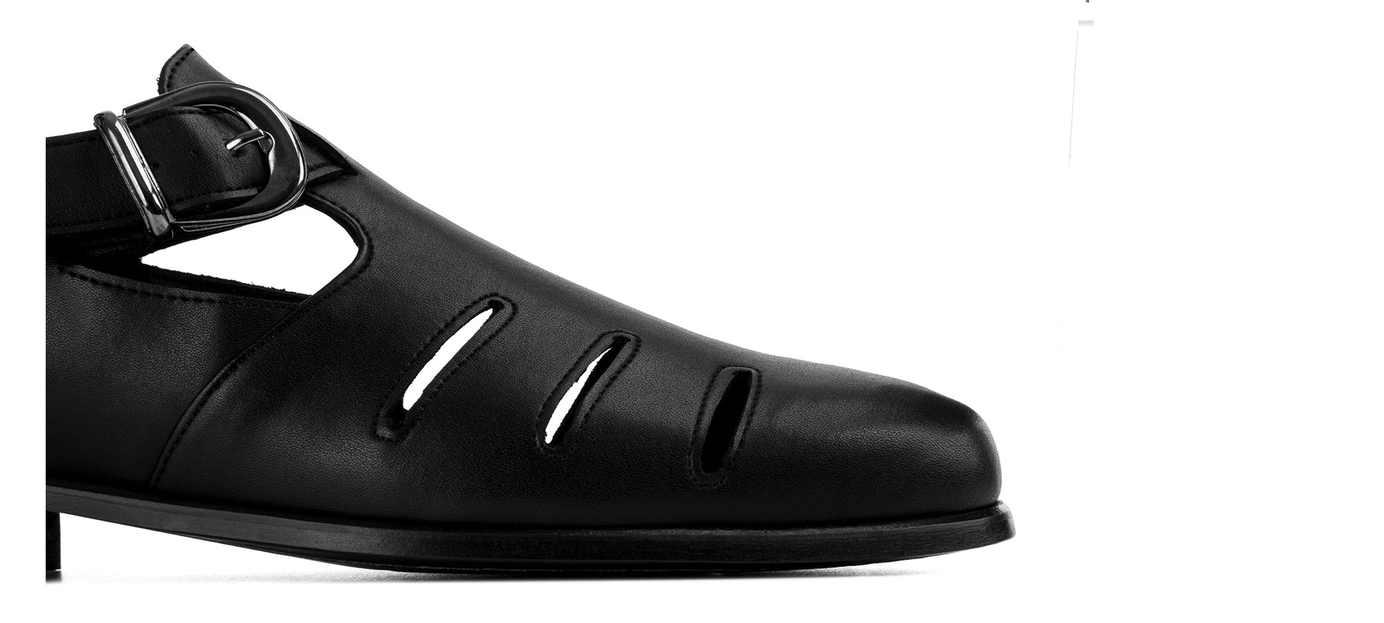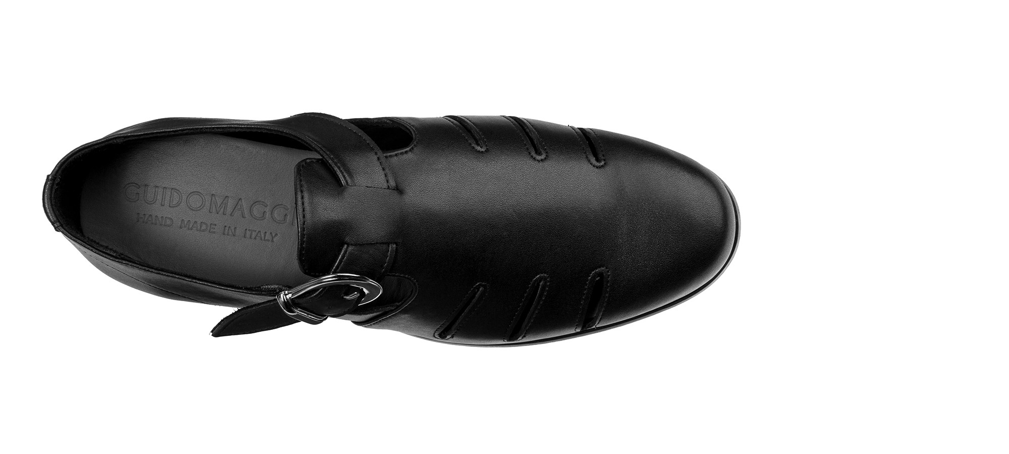 Sandale cage artisanale exclusive dotée d'une tige en cuir pleine fleur de Toscane noir de première qualité. Se distinguant par une silhouette hybride qui mêle charme rétro et détails essentiels contemporains, ce modèle cage présente une semelle en cuir avec une bande de roulement en caoutchouc antidérapante. La fermeture par boucle latérale complète un design casual chic unique. Grâce au système rehaussant GUIDOMAGGI, elle augmente la taille de manière totalement invisible jusqu'à 6 cm, pour un style estival sans compromis.